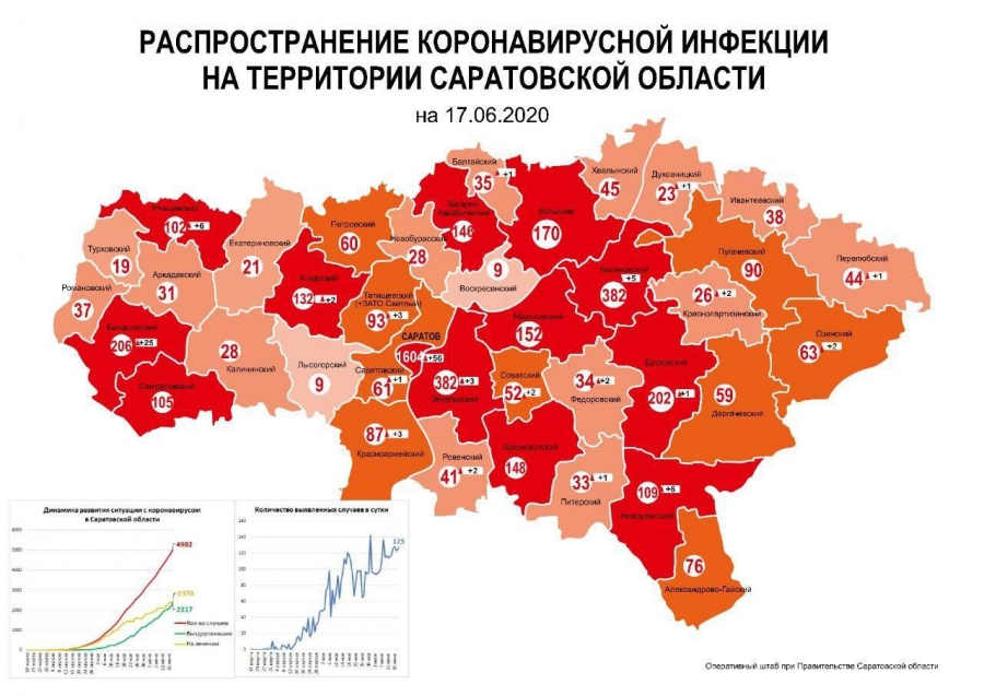 Число случаев с начала пандемии распределяется по муниципалитетам следующим образом: Саратов - 1604 случая; от 300 до 400 случаев - Энгельсский и Балаковский районы. От 200 до 300 случаев - Балашовский и Ершовский; от 100 до 200 случаев - Вольский, Марксовский, Краснокутский, Базарно-Карабулакский, Аткарский, Новоузенский, Самойловский и Ртищевский;