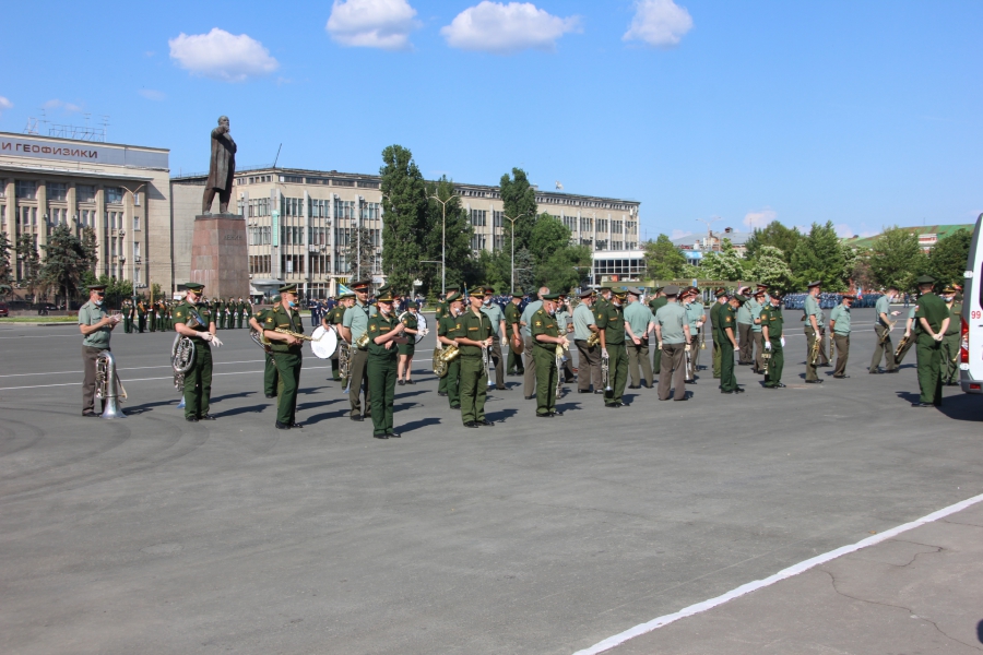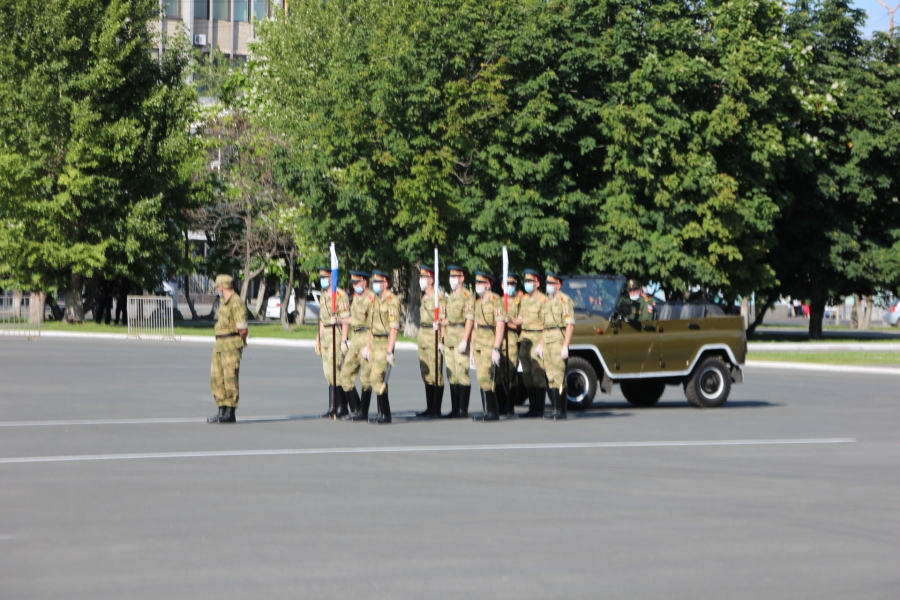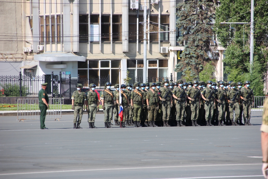 По площади прошли несколько подразделений армии и казачество, отрепетировал военный оркестр, после чего военные погрузились в транспорт и покинули город. По словам корреспондента 4В, большинство участников шествия были в защитных масках, правда некоторые неправильно их носили – спустили с лица вниз на шею.