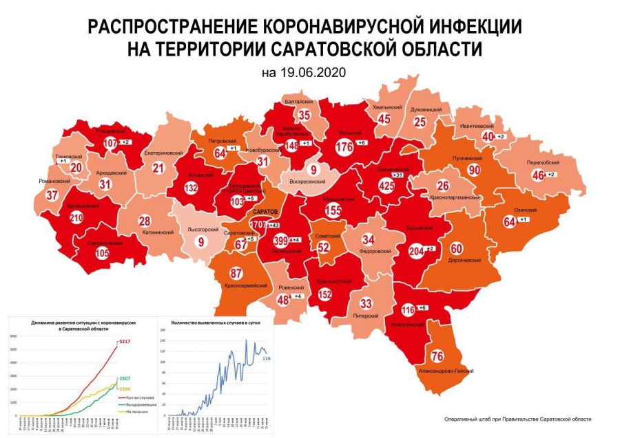 Число случаев с начала пандемии распределяется по муниципалитетам следующим образом: Саратов — 1707 случаев; от 400 до 500 случаев — Балаковский район; от 300 до 400 случаев — Энгельсский; от 200 до 300 случаев — Балашовский и Ершовский.