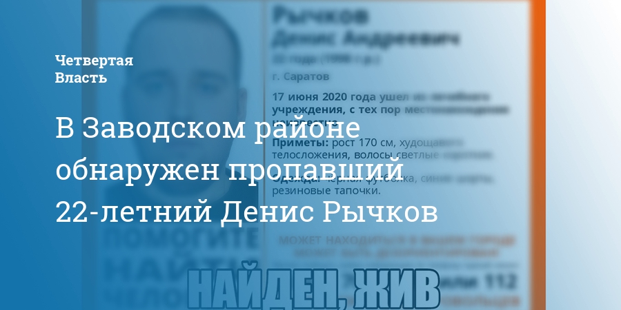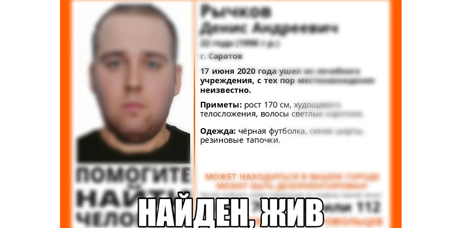 В Заводском районе Саратова найден живым пропавший 17 июня 22-летний Денис Рычков. Об этом сообщает поисковый отряд «Лиза Алерт».