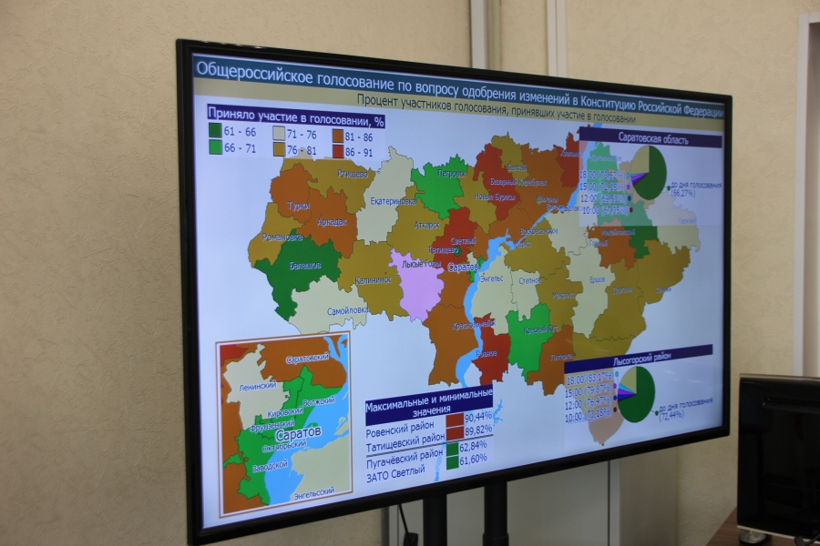 Избирком региона продолжает обновлять данные о явки проголосовавших по поправкам к конституции. По данным на 18.00, ситуация изменилась не сильно: в Саратовской области общая явка составила 74,47%, а в Саратове – 69,46 %. Всего по Саратовской области проголосовало более 1,3 миллиона человек.