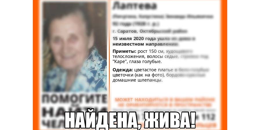 «Найдена, жива Лаптева (Пичугина, Капустина) Зинаида Ильинична. Всем большое спасибо, просьба снять репосты», - кратко написали волонтеры.