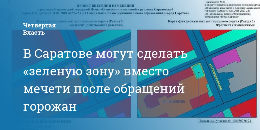 Речь об участке по улице Серова, 14 (район Ильинской площади). Жители Саратова обратились в городскую администрацию с просьбой изменить функциональность этого участка земли с зоны «культовых сооружений» на «озелененные территории общего пользования (парки, сады, скверы)». Из документа администрации также следует, что на этом участке в 1382 кв. м. планировалось построить мечеть.