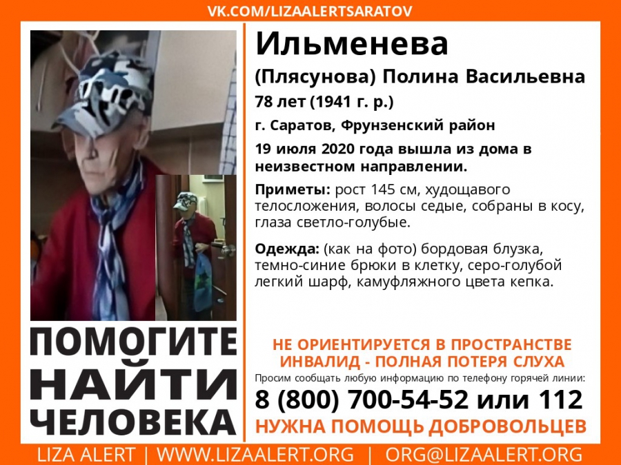 Во Фрунзенском районе Саратова без вести пропала 78-летняя Полина Ильменева (Плясунова). Об этом сообщают поисковики отряда «Лиза Алерт».