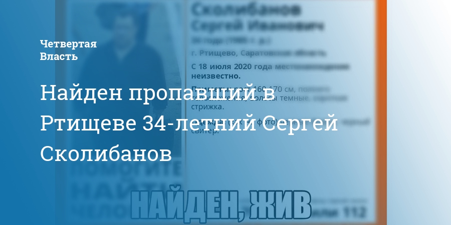 В Ртищеве Саратовской области найден живым без вести пропавший 34-летний Сергей Сколибанов. Об этом сообщает поисковый отряд «Лиза Алерт».