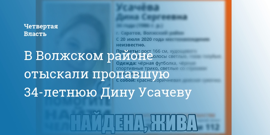 В Волжском районе Саратова найдена живой потерявшая 20 июля 34-летняя Дина Усачева. Об этом сообщили поисковики отряда «Лиза Алерт».