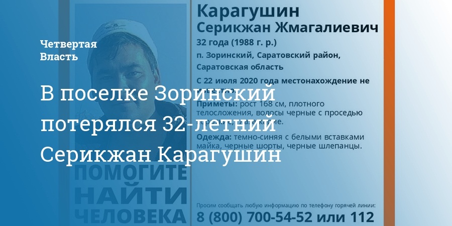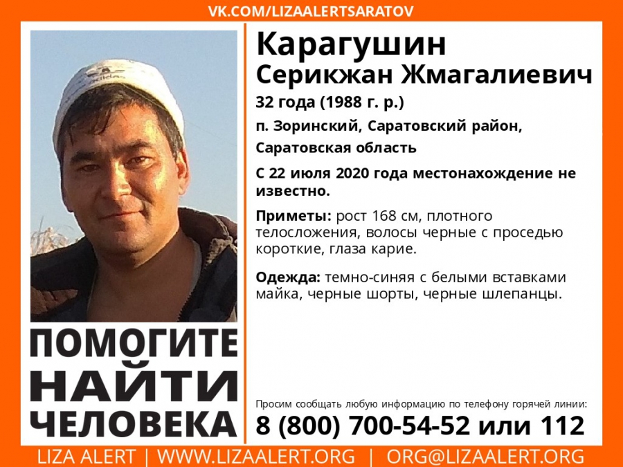 В поселке Зоринский Саратовского района потерялся 32-летний Серикжан Карагушин. Об этом сообщает поисковый отряд «Лиза Алерт».