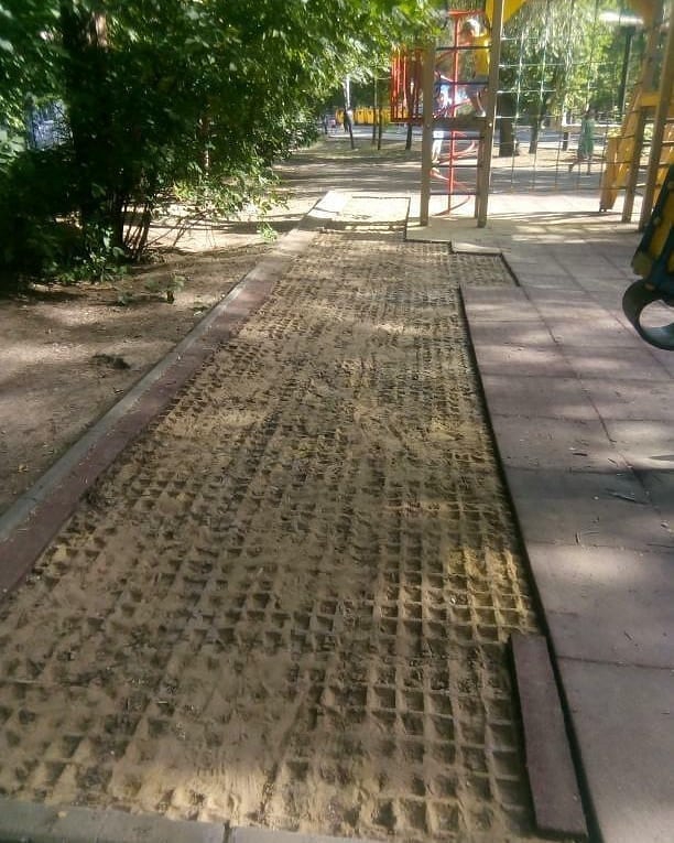 На приложенной к посту фотографии видно, что часть резинового покрытия на площадке отсутствует. Его разобрали по квадратикам, оставив лишь песочное основание.