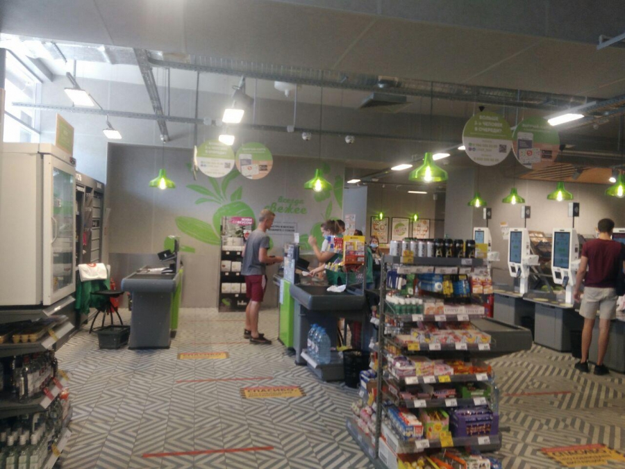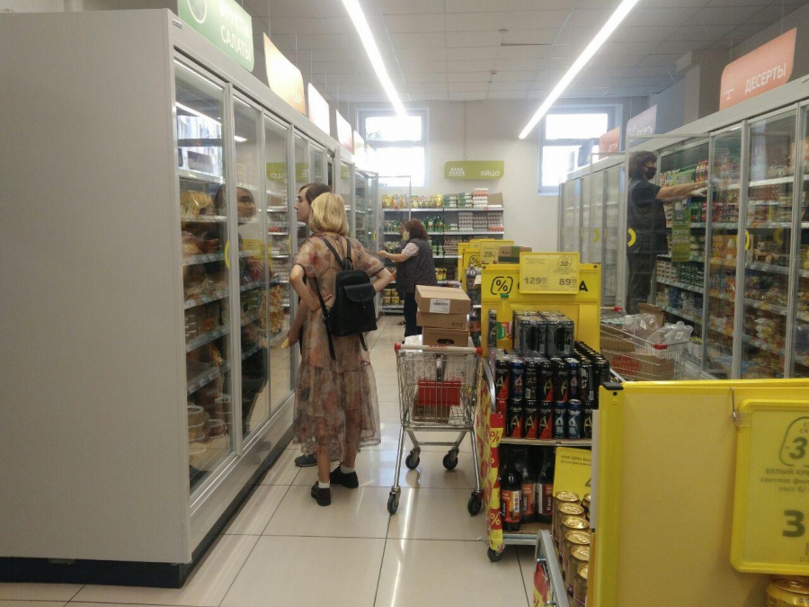 Продавец Татьяна рассказала, что кто-то из покупателей приходит в маске, а кто-то без. На входе в магазин висит объявление с требованием надеть маску и соблюдать дистанцию.