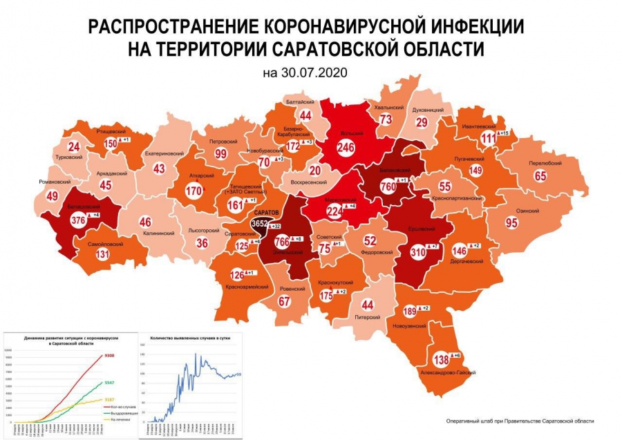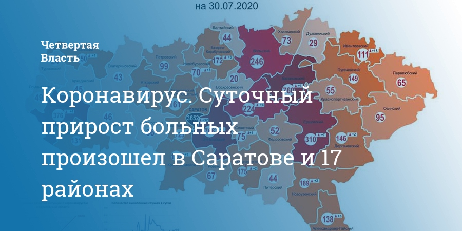 Основная прибавка больных отмечена в Саратове (плюс 32 случая), на втором месте Ивантеевский район (плюс 15 случаев), на третьем - Энгельсский (плюс 8 случаев), Далее следуют Ершовский район (плюс 7 случаев), Александрово-Гайский и Саратовский (по 6 в каждом), Марксовский и Балашовский (по 4 случая), Базарно-Карабулакский и Новобурасский (по 3 случая), Краснокутский, Новоузенский, Дергачевский (по 2). По одному больному за сутки обнаружили в Балаковском, Ртищевском, Советском, Красноармейском и Татищевском районах.
