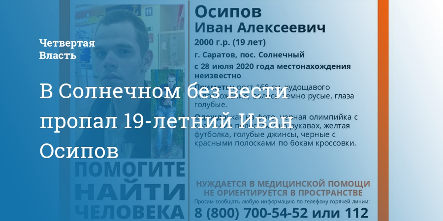 В саратовском поселке Солнечный пропал без вести 19-летний Иван Осипов. Как сообщают поисковики отряда «Лиза Алерт», парень нуждается в медицинской помощи и не ориентируется в пространстве.