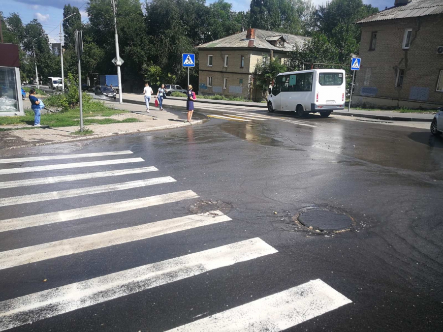 Мощный поток воды устремился вверх из середины канализационного люка. Предположительно, эта авария стала следствием проводимых ремонтных работ на другом участке неподалеку. В результате сейчас подтоплена не только проезжая часть, но и пешеходные переходы.