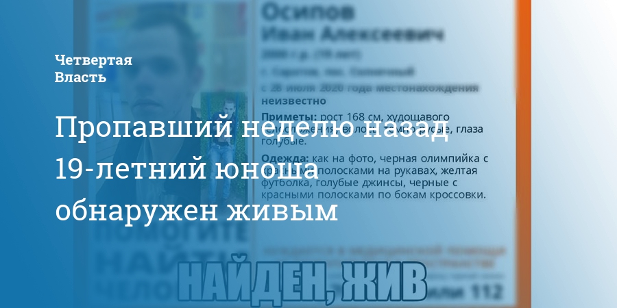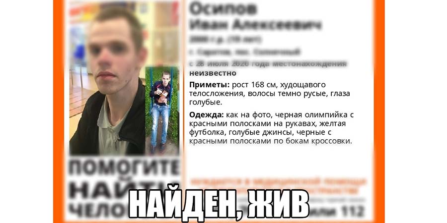 Без вести пропавший в Саратове 19-летний Иван Осипов обнаружен живым. Об этом сообщили волонтеры поискового отряда «Лиза Алерт».