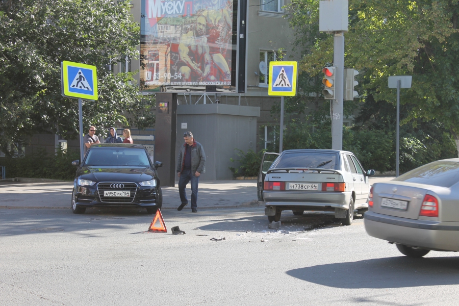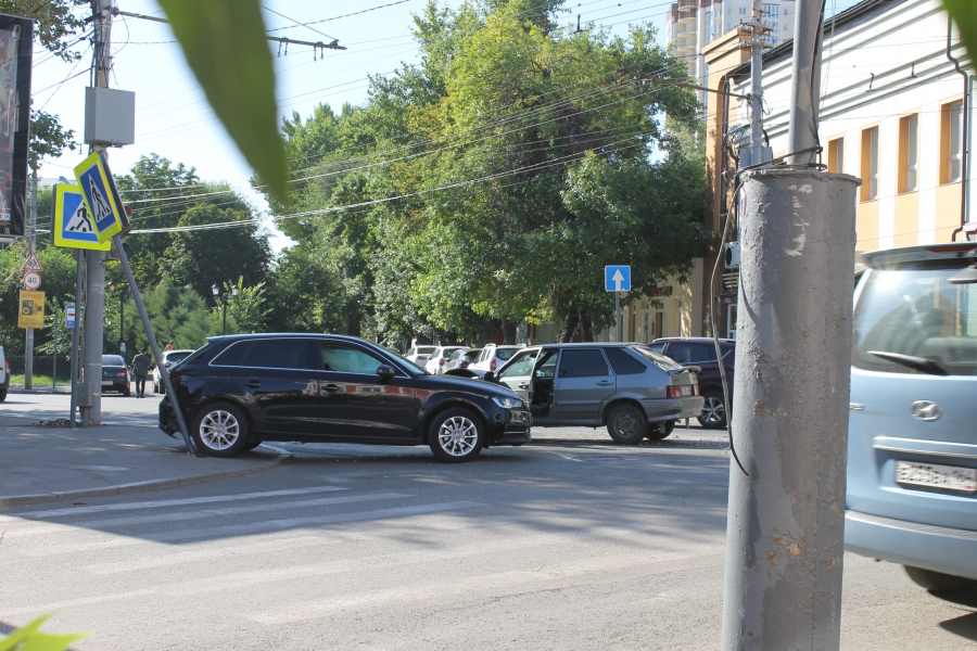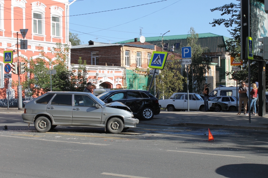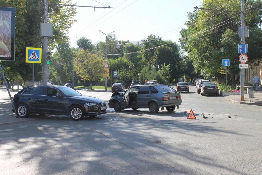 Авария произошла на перекрестке улиц Московской и Октябрьской, здесь столкнулись машины «Ауди А3» и «ВАЗ-2114». Удар пришелся иномарке в левую сторону (двери сильно смяты), задней частью автомобиль задел дорожный знак «Пешеходный переход», который покосился. У отечественной легковушки искорежена передняя часть: повреждены капот, бампер, левое крыло.