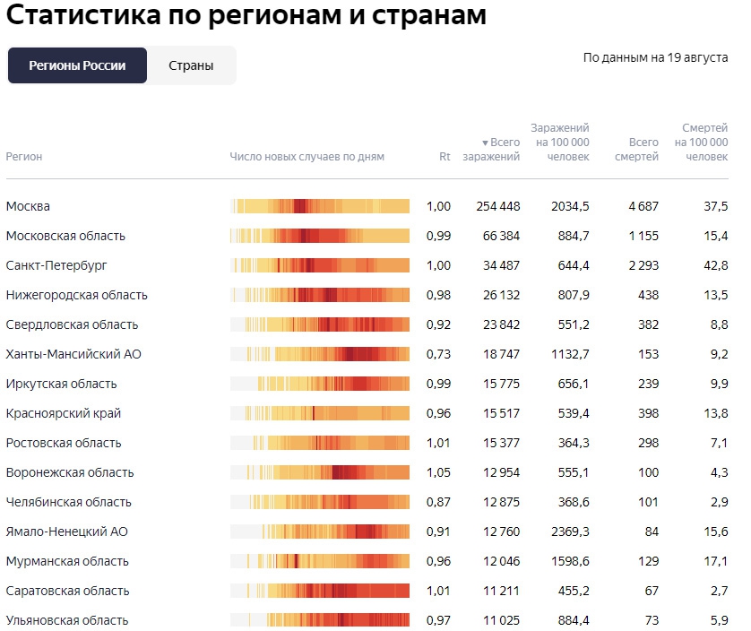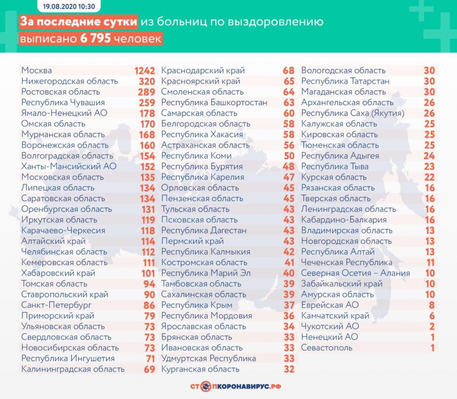 По состоянию на 19 августа, в нашем регионе 11 211 случаев заражений COVID-2019 (14-е место в РФ). При этом за сутки прибавилось еще 95 больных (12-е место по приросту в стране).