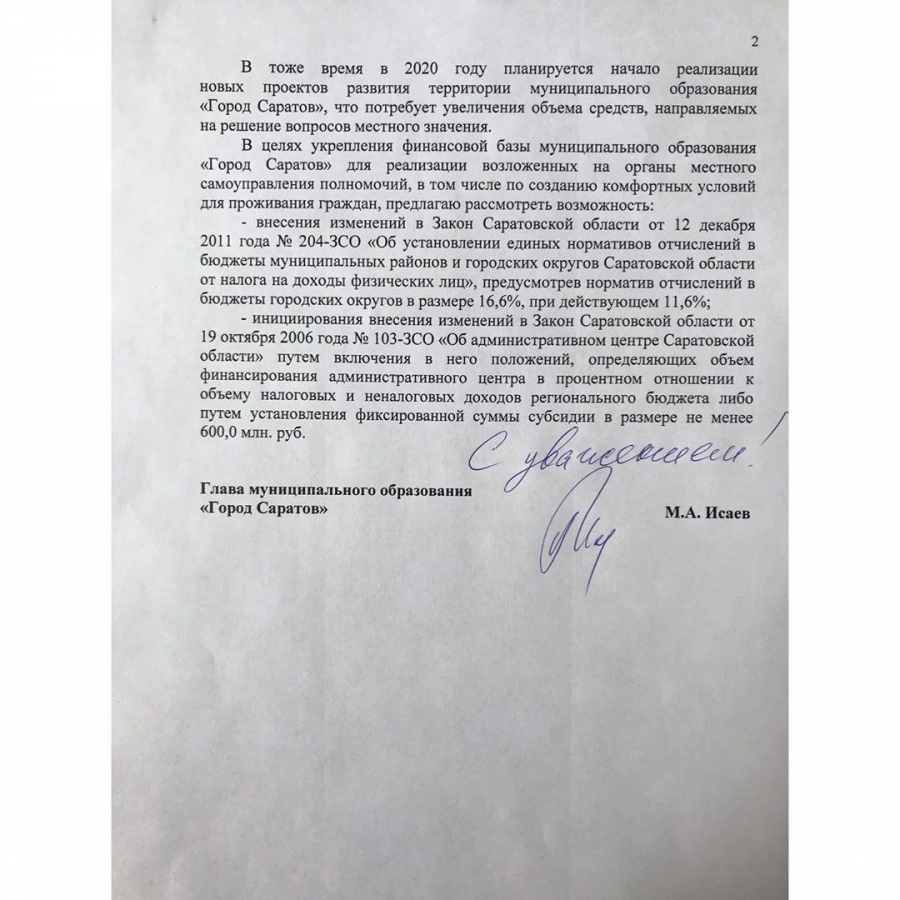 Для создания комфортных условий проживания населения и борьбы с его оттоком Исаев предлагает увеличить на 5% (с 11,6% до 16,6%) норматив отчислений от налога на доходы физических лиц в бюджеты городских округов (как это было до 2014 года), а также предусмотреть субсидии Саратову на законодательном уровне как административному центру области.