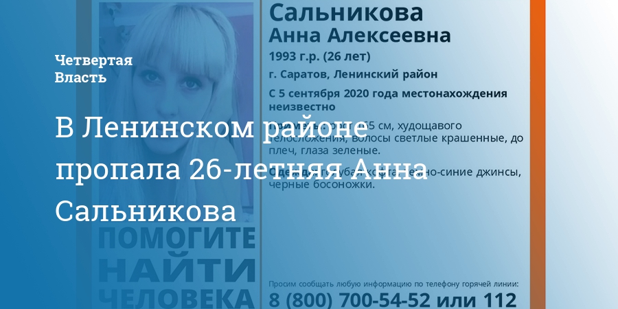 В Ленинском районе Саратова без вести пропала 26-летняя Анна Сальникова. Об этом сообщают поисковики отряда «Лиза Алерт».