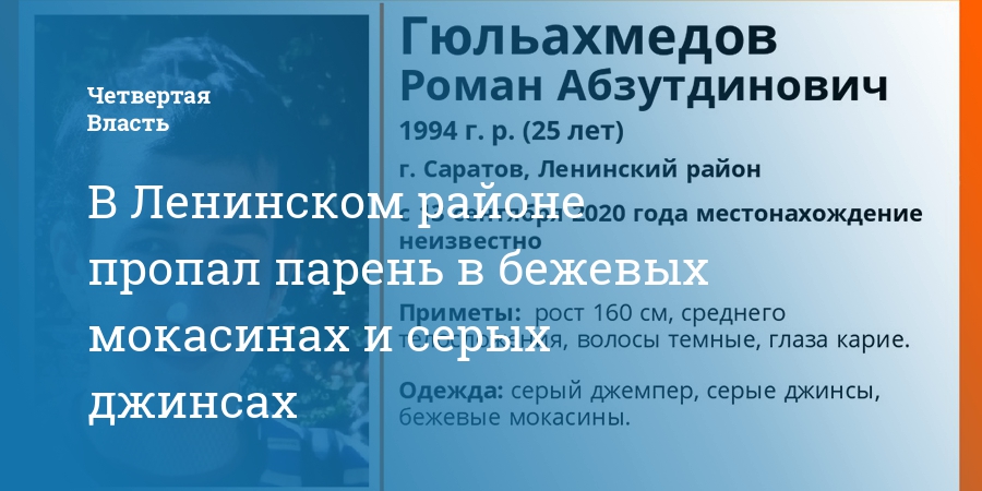 В Ленинском районе Саратова объявлен в розыск как без вести пропавший 25-летний Роман Гюльахмедов. Как сообщает поисковый отряд «Лиза Алерт», он не дает о себе знать с 13 сентября.