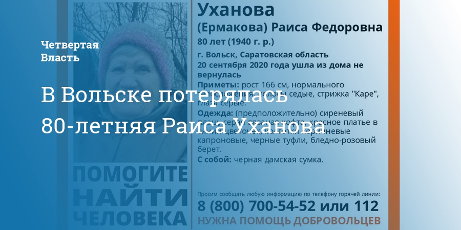 Вчера, 20 сентября, в Вольске Саратовской области потерялась 80-летняя Раиса Уханова (Ермакова). Об этом сообщает поисковый отряд «Лиза Алерт».