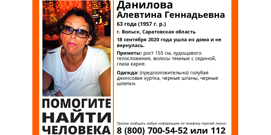 В Саратовской области поиск пропавшей почти неделю назад 63-летней Алевтины Даниловой не увенчались успехом. Об этом сообщают волонтеры поискового отряда «Лиза Алерт».