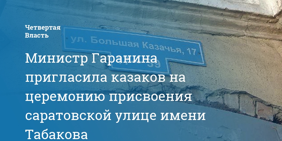 Министр культуры Саратовской области Татьяна Гаранина заверила саратовских казаков, что не хотела переименовать улицу Большую Казачью в честь Олега Табакова. Об этом она сообщила в письме к представителям международного казачьего объединения «Великое братство казачьих войск», оно имеется в распоряжении редакции «Четвертая Власть».