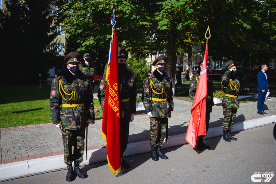 Алексей Захаров вручил награды сотрудникам Военного учебного центра при СГТУ, который является ровесником вуза и также в эти дни отмечает юбилей.