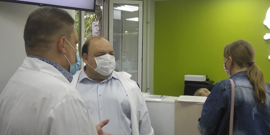 Олег Костин положительно оценил новую входную группу и выстроенную систему работы медперсонала. После этого он осмотрел прежний вход, который теперь планируется использовать для доступа в учреждение работников и посетителей в стационар.