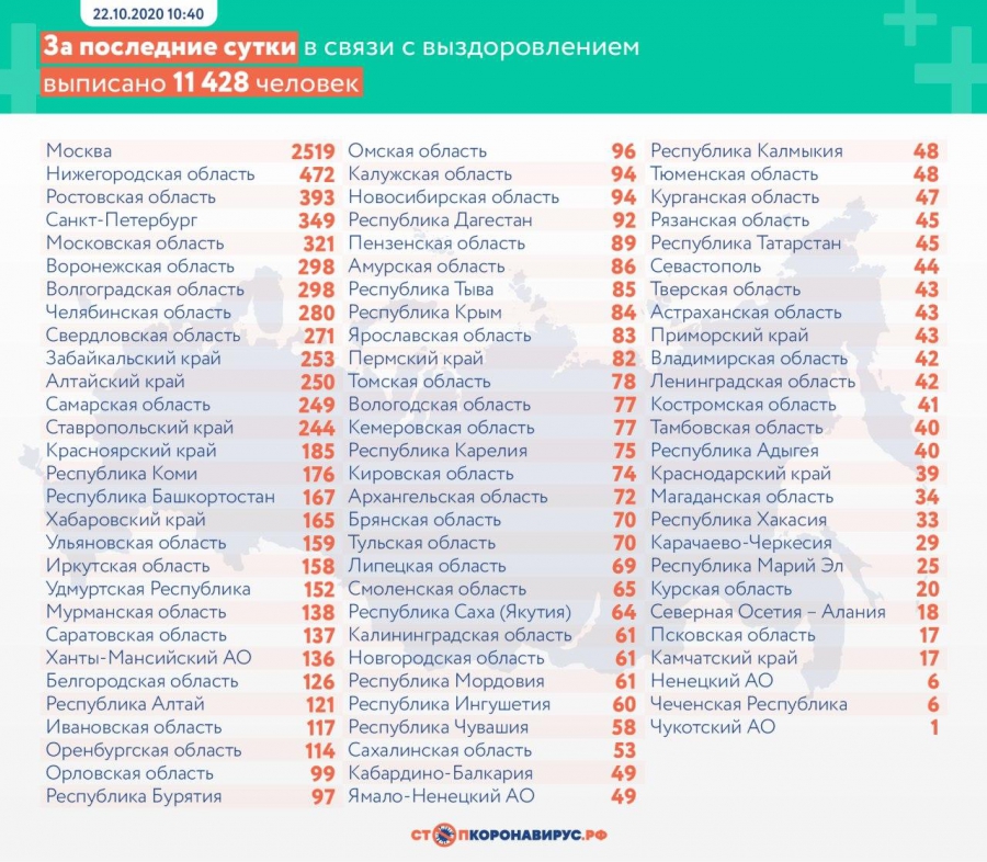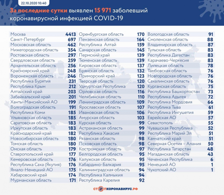 По России за сутки прибавилось 15 971 заболевший, с начала пандемии – 1 463 306. Умерли от коронавируса за день 290 человек, всего – 25 242. Выписаны из больниц 11 428 пациентов, с начала пандемии – 1 107 988.