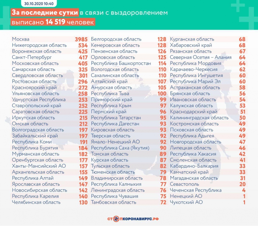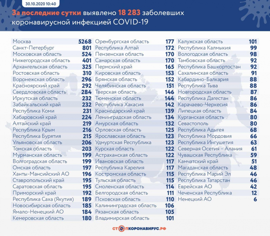 На территории России за сутки выявили рекордное число зараженных коронавирусной инфекцией – 18 283 человека. По данным на 30 октября, общее количество случаев заражения составляет 1 599 976.