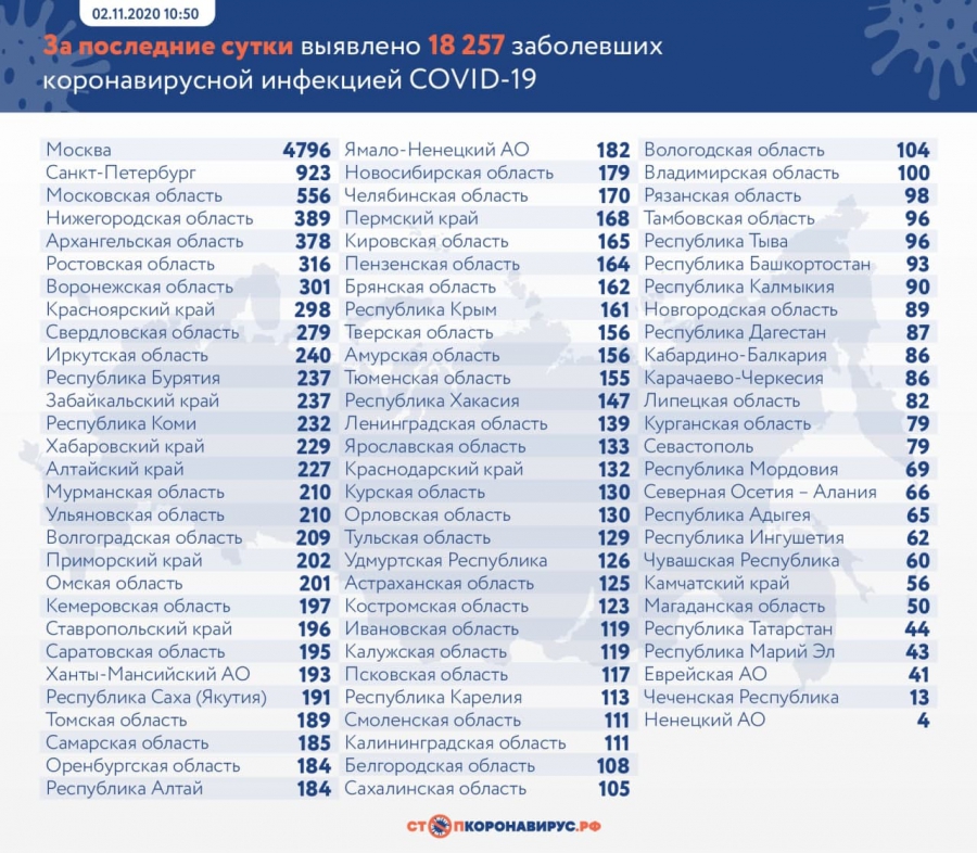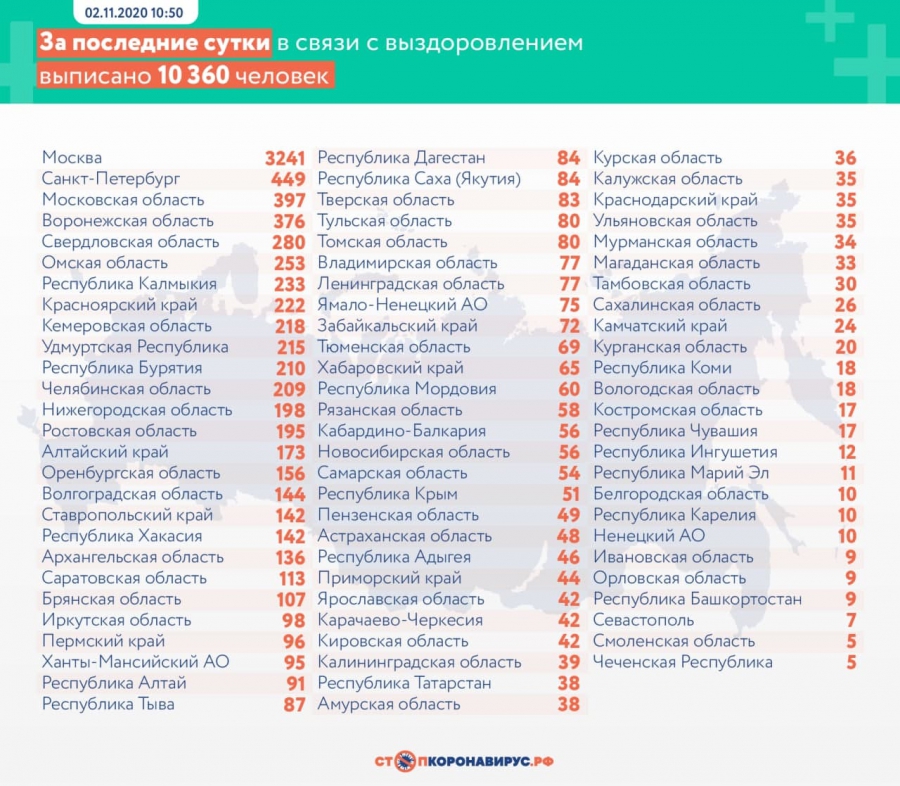 Согласно данным оперативного штаба, на 2 ноября в стране обнаружили 1 655 038 зараженных. Количество умерших от коронавируса прибавилось еще на 238 человек, общее число жертв уже 28 473. При этом выздоровевшими считаются 1 236 033 пациента (за сутки выписали 10 360).