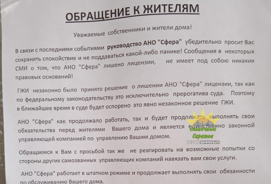 В Саратове руководство лишенной лицензии АНО «Сфера» (бывшее АТСЖ Ленинского района) призывает жителей не верить информации СМИ. Соответствующие листовки появились на подъездах некоторых многоквартирных домов.