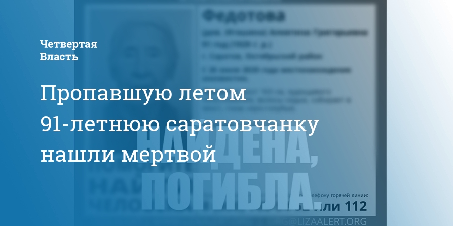 В Октябрьском районе Саратова завершены поиски 91-летней Алевтины Федотовой (Игошиной), без вести пропавшей еще летом. Об этом информируют волонтеры поискового отряда «Лиза Алерт».
