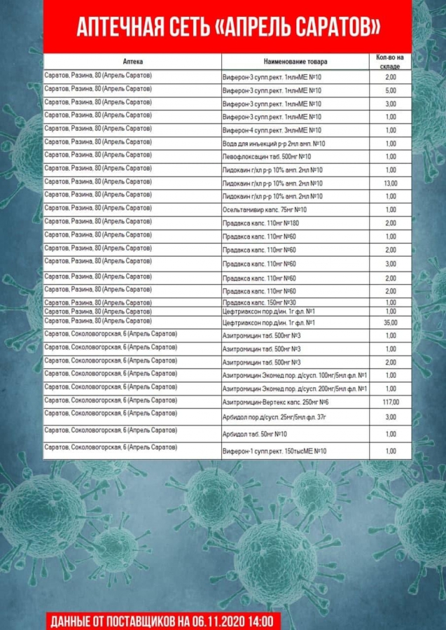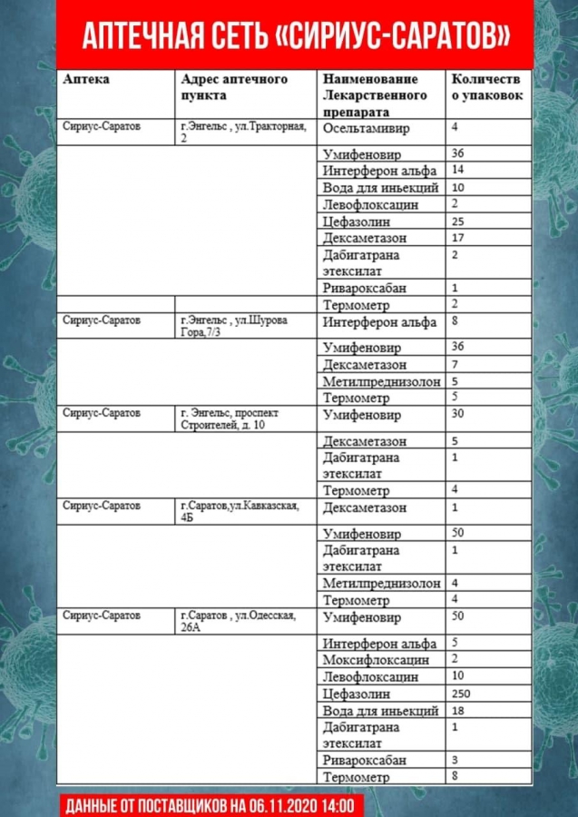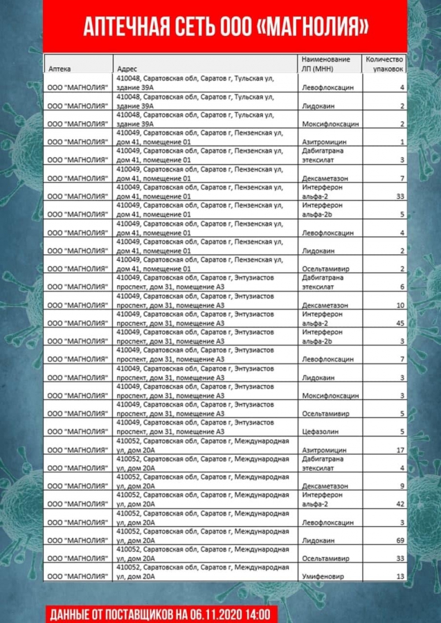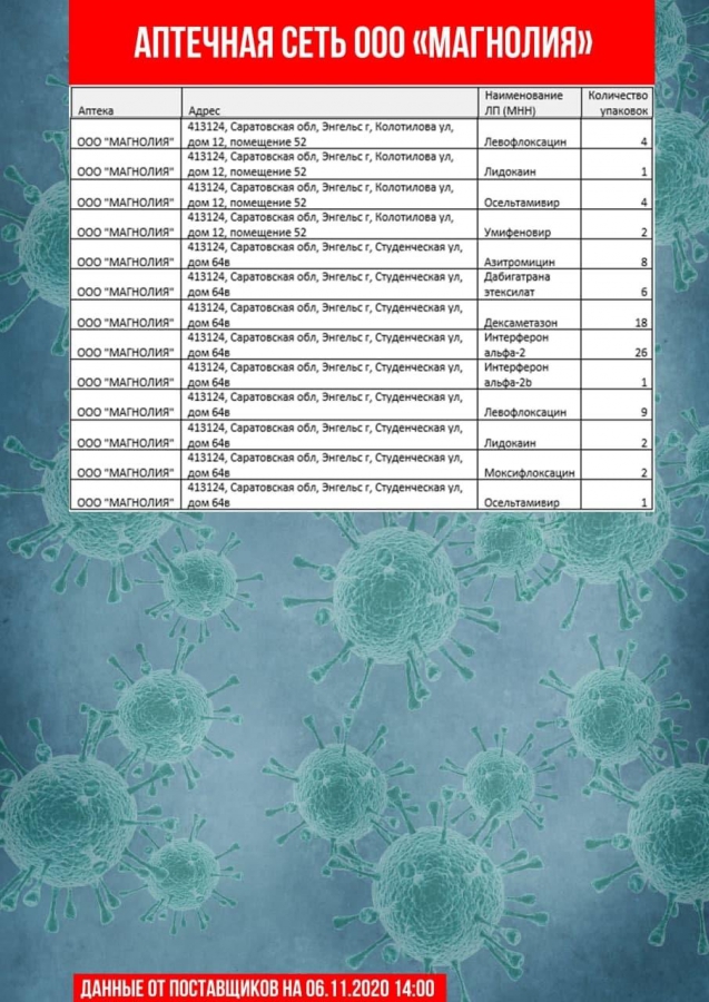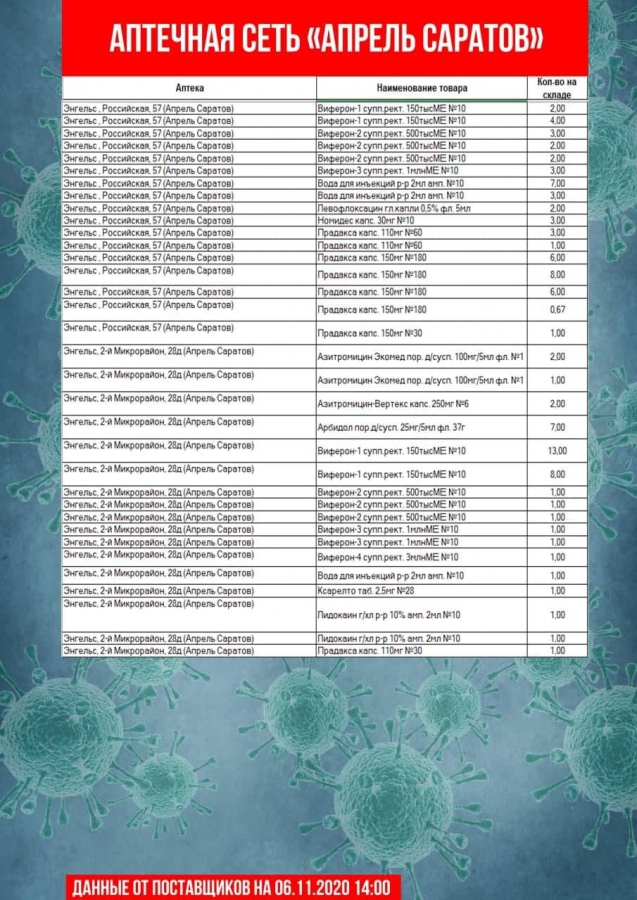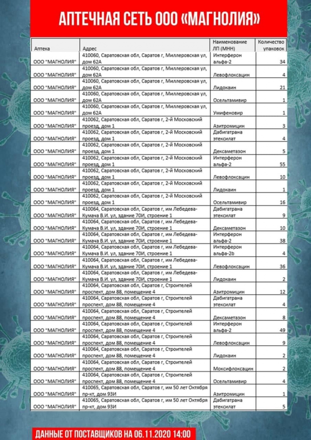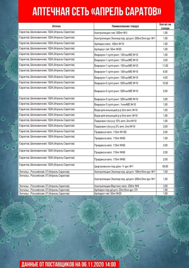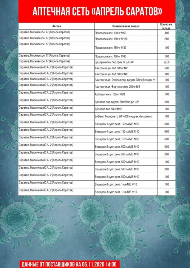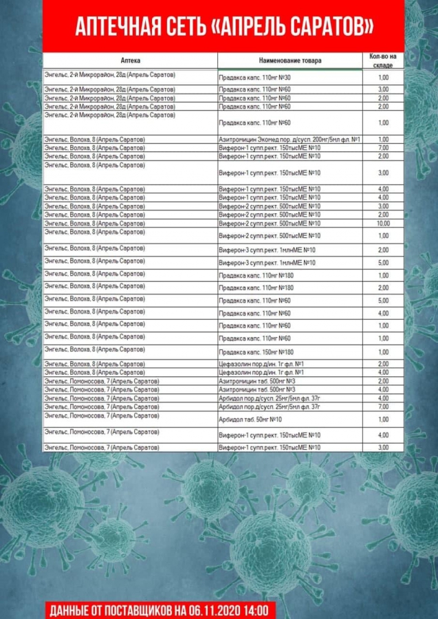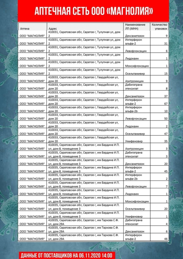 Сегодня, 6 ноября, в телеграм-канале «СтопКоронавирус_Саратовская область» обновлен список адресов аптек с самыми необходимыми препаратами для населения. Данные актуальны на 14.00.