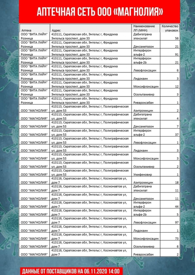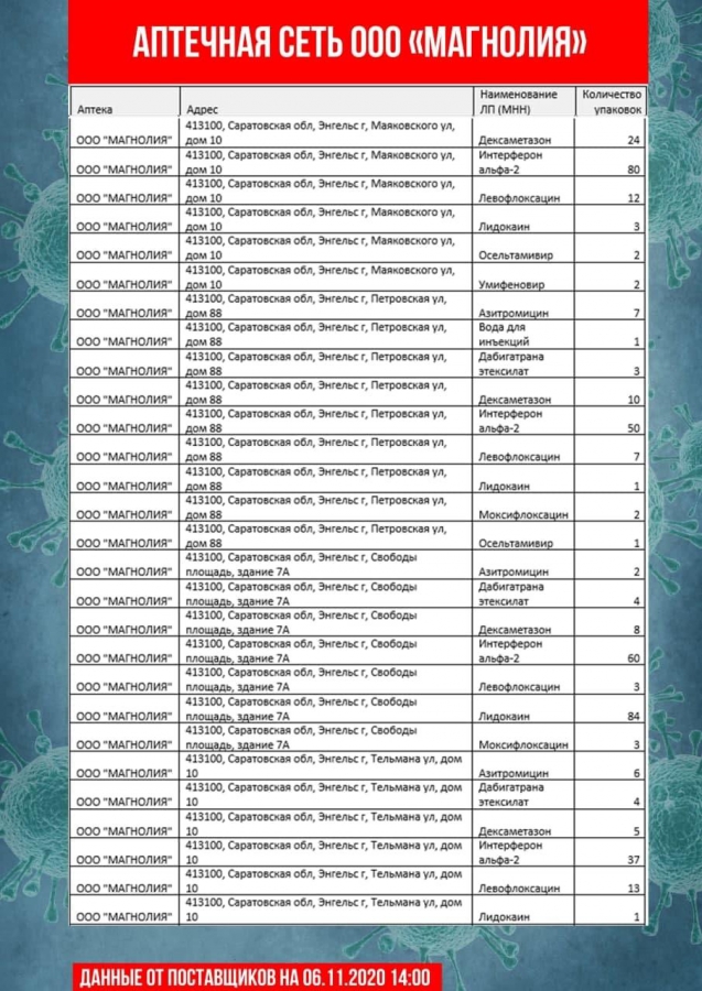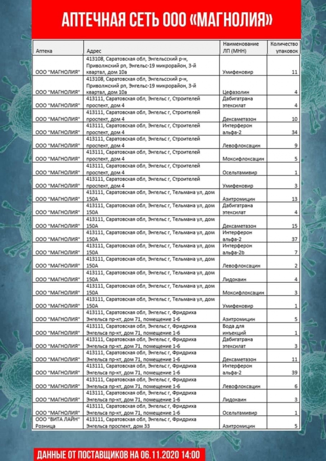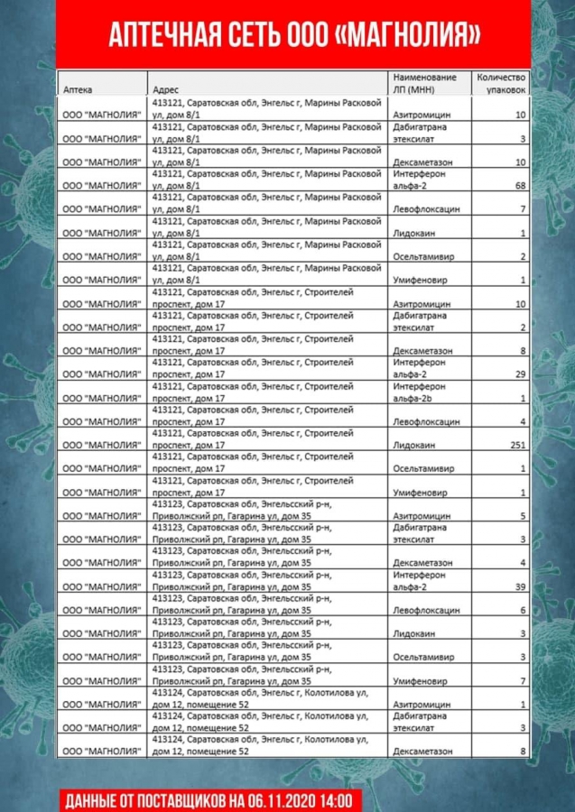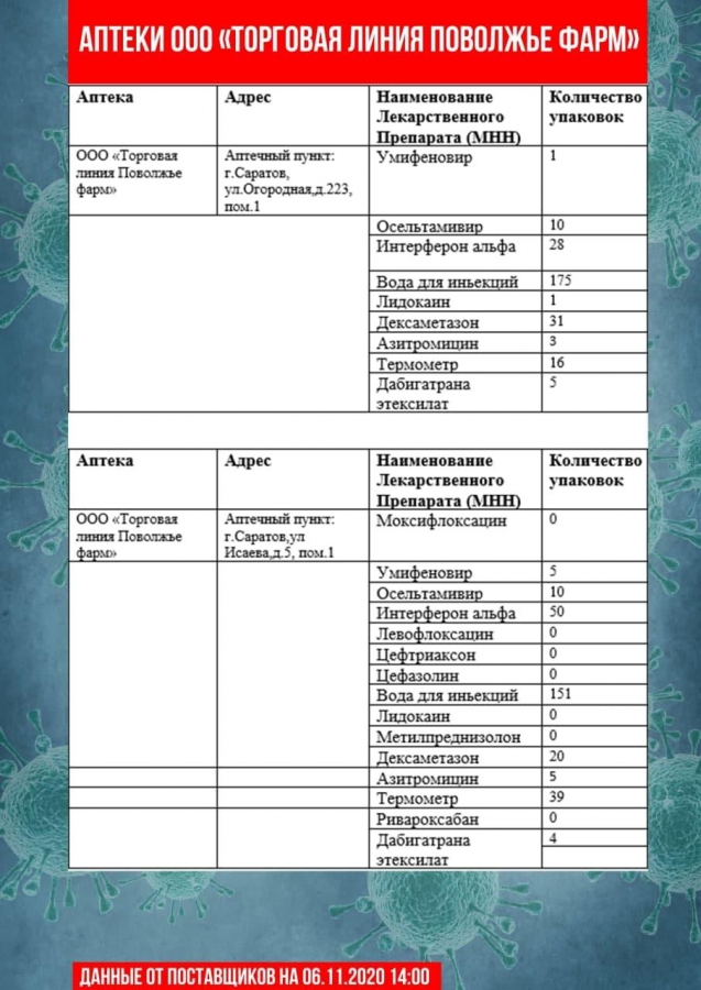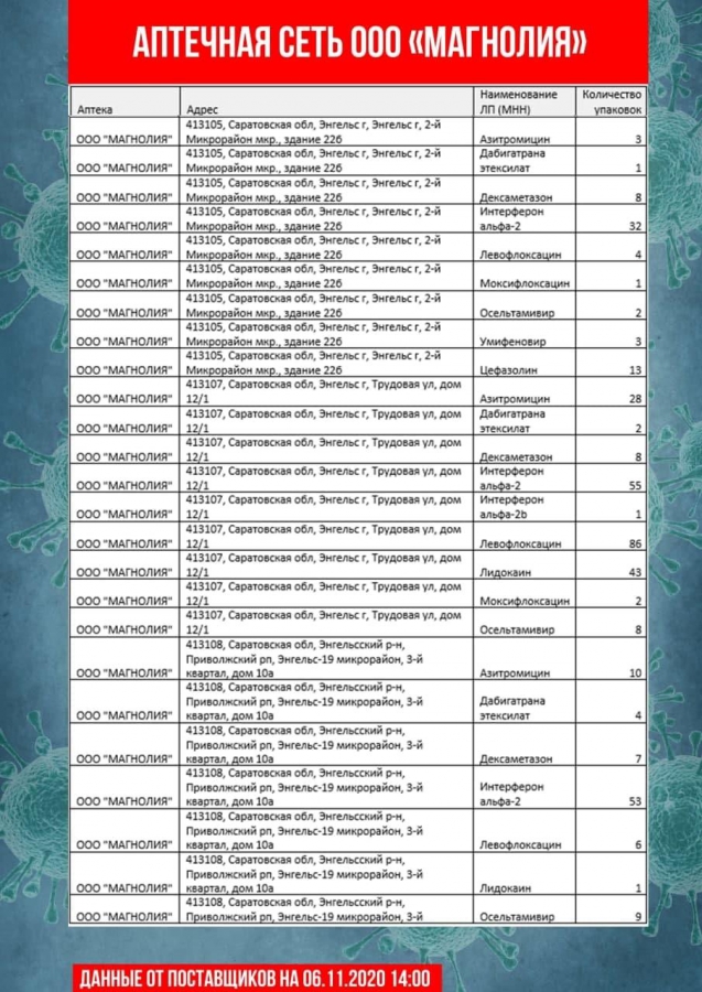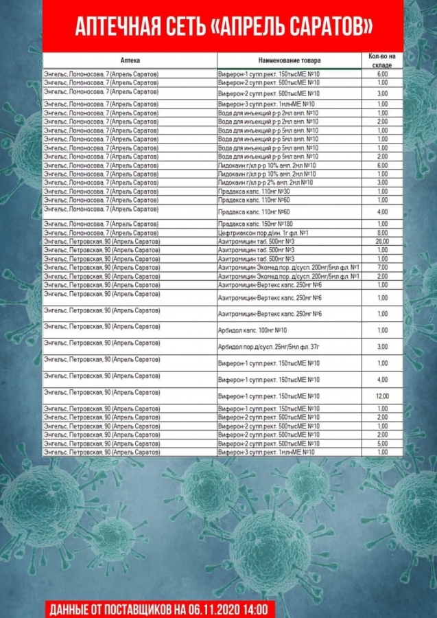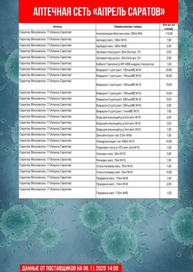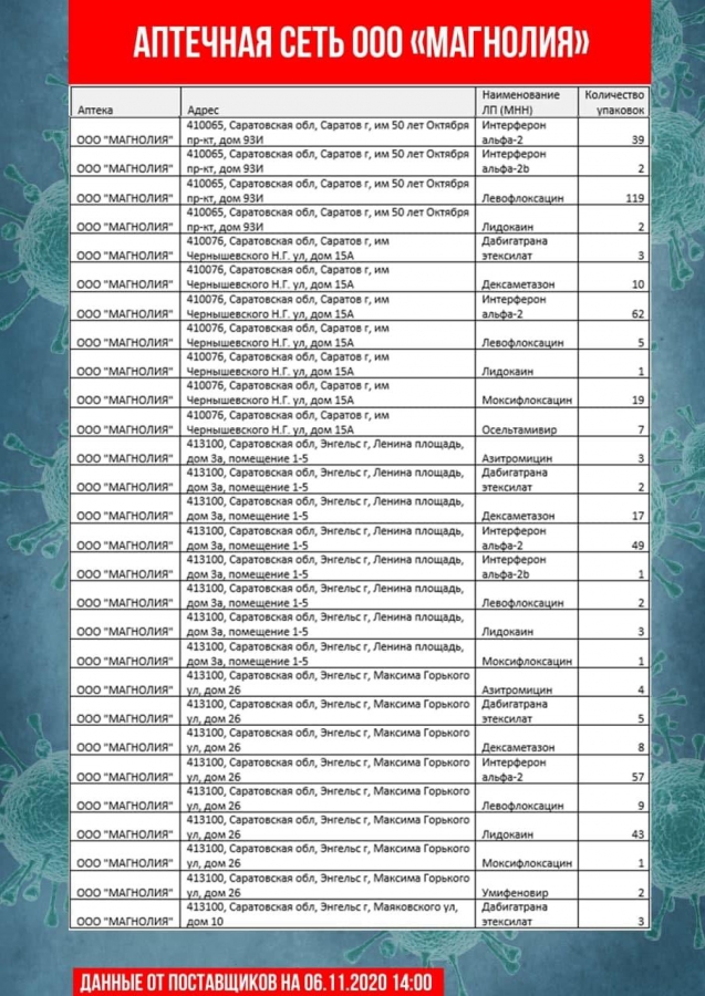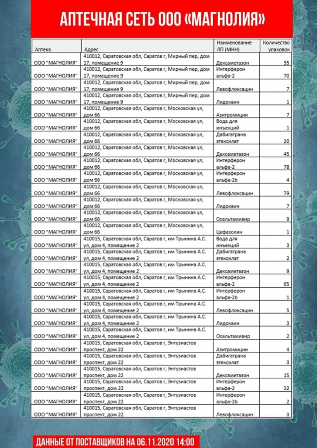 Сегодня, 6 ноября, в телеграм-канале «СтопКоронавирус_Саратовская область» обновлен список адресов аптек с самыми необходимыми препаратами для населения. Данные актуальны на 14.00.