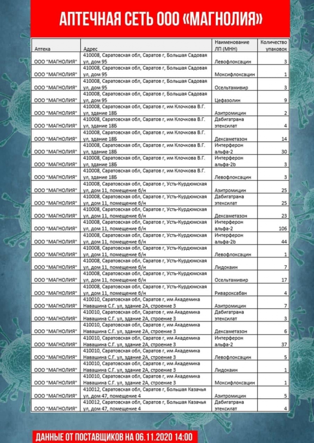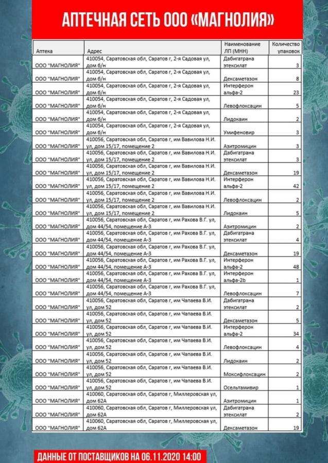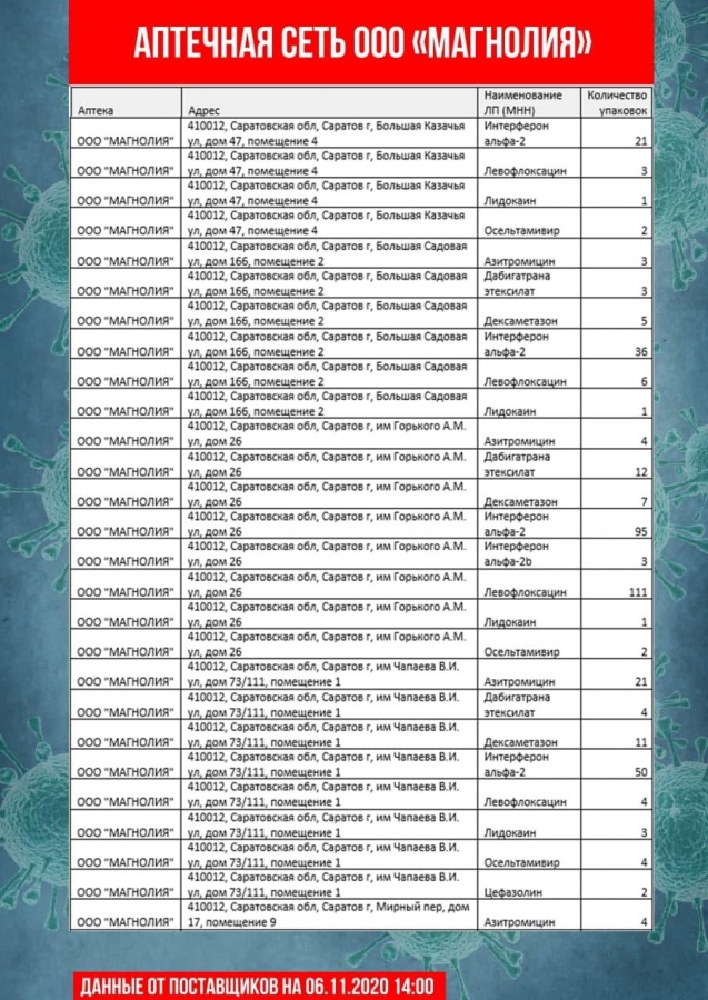 Чиновники отчитались перед жителями о наличии медикаментов в сети аптек «Апрель Саратов», «Торговая линия Поволжье фарм», «Столет», «Магнолия», «Сириус-Саратов», «Ригла», «Мир лекарств» и «Аптека Северная».