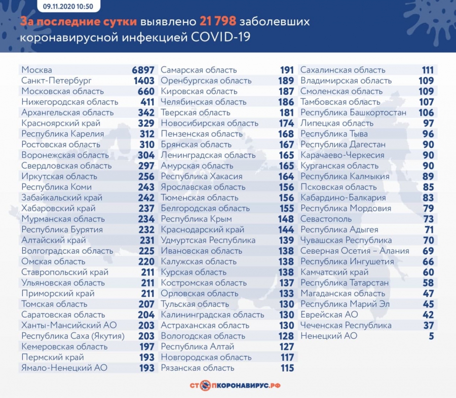 На территории России за минувшие сутки выявили еще 21 798 заболевших коронавирусной инфекцией, что является максимумом с начала пандемии. По данным оперативного штаба, на 9 ноября в стране числится 1 796 132 случая заражения.