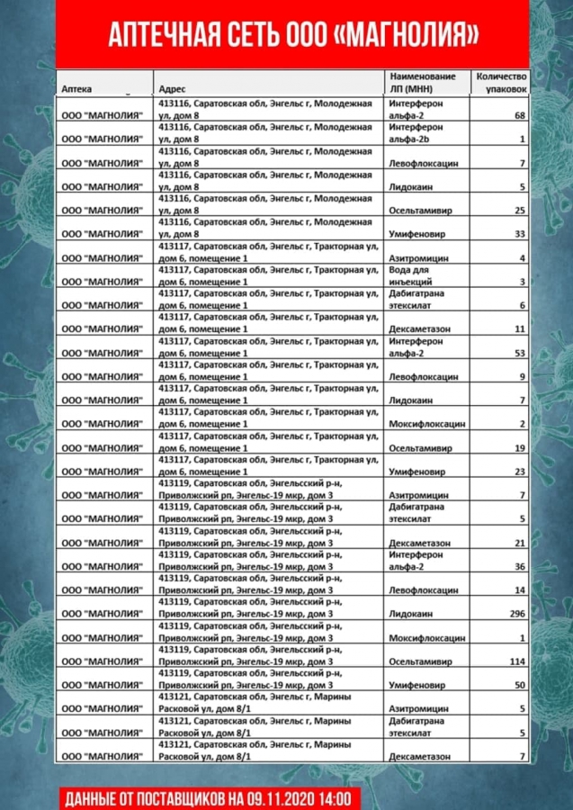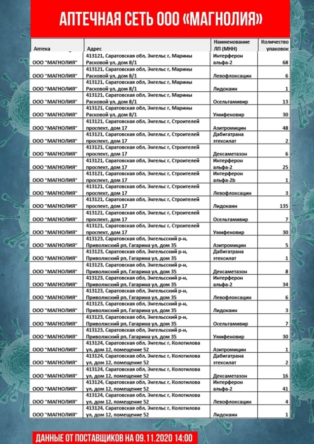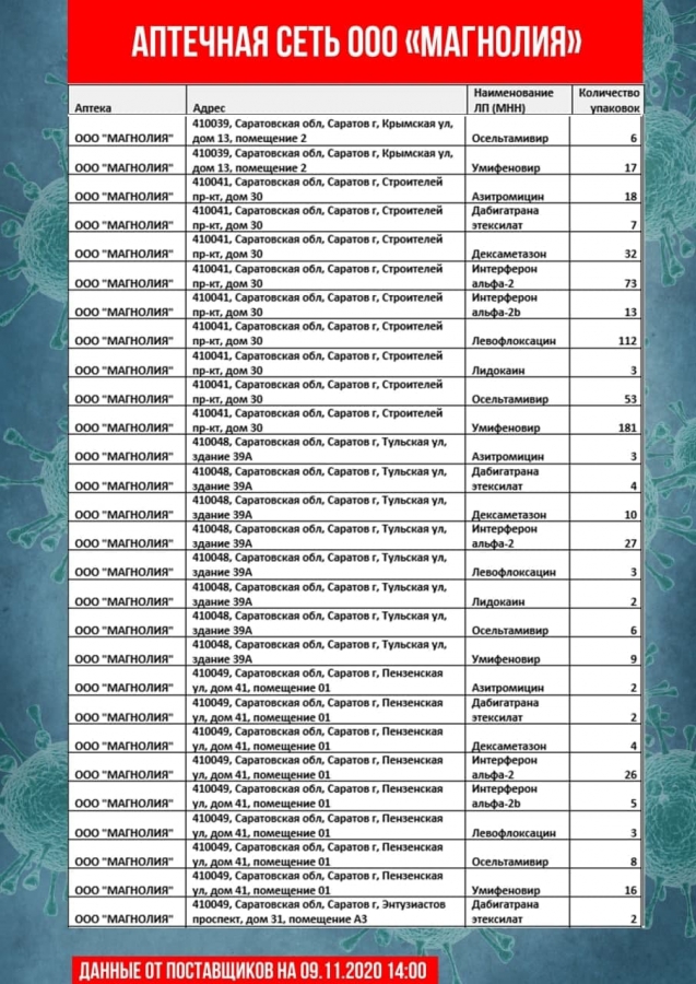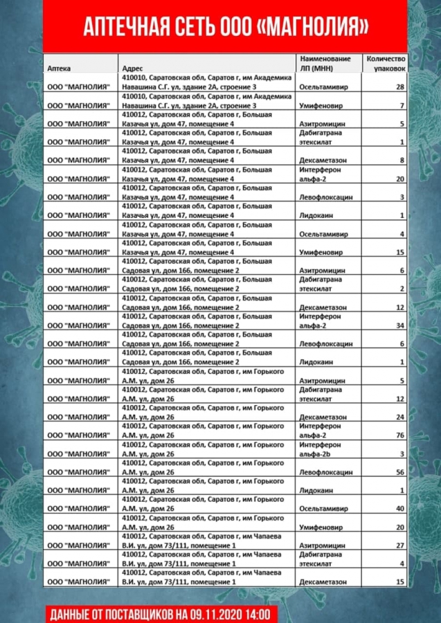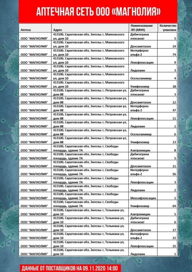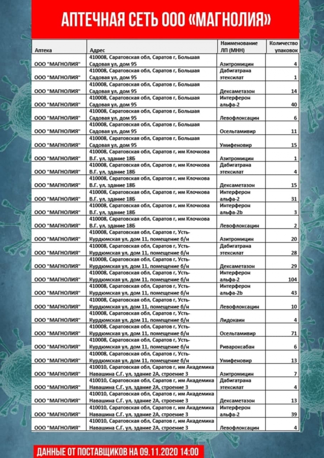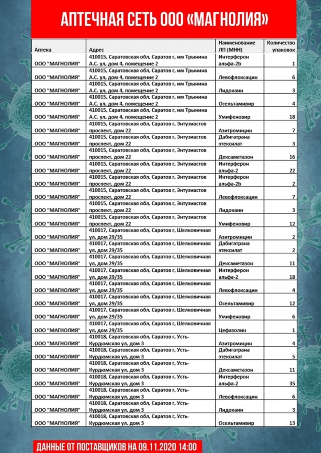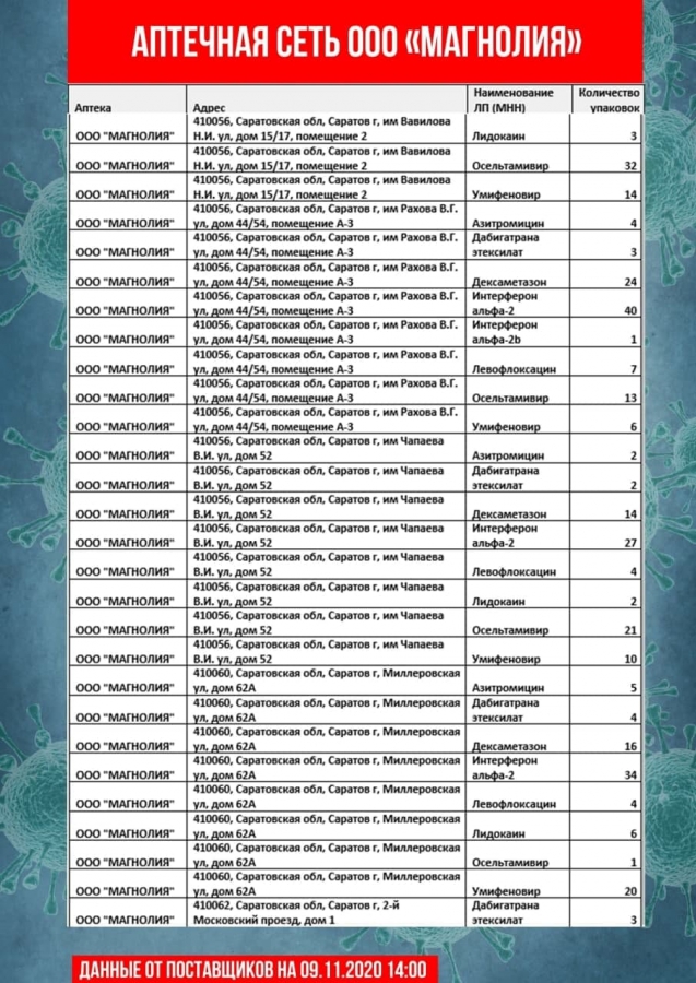 В списке отражены данные по 6 сетям аптек в Саратове и Энгельсе: «Магнолия», «Апрель Саратов», «Мир лекарств» «Ригла», «Аптека Северная» и «Сириус-Саратов». Приводятся названия препаратов, которые сейчас пользуются большим спросом, особенно на фоне пандемии коронавирусной инфекции, а также их количество непосредственно в аптеке и на складах.