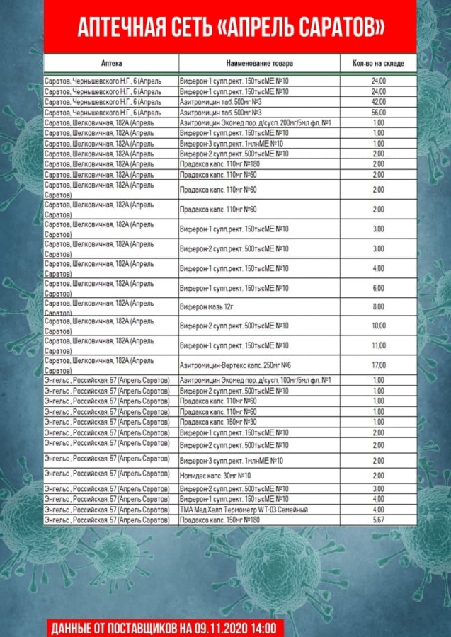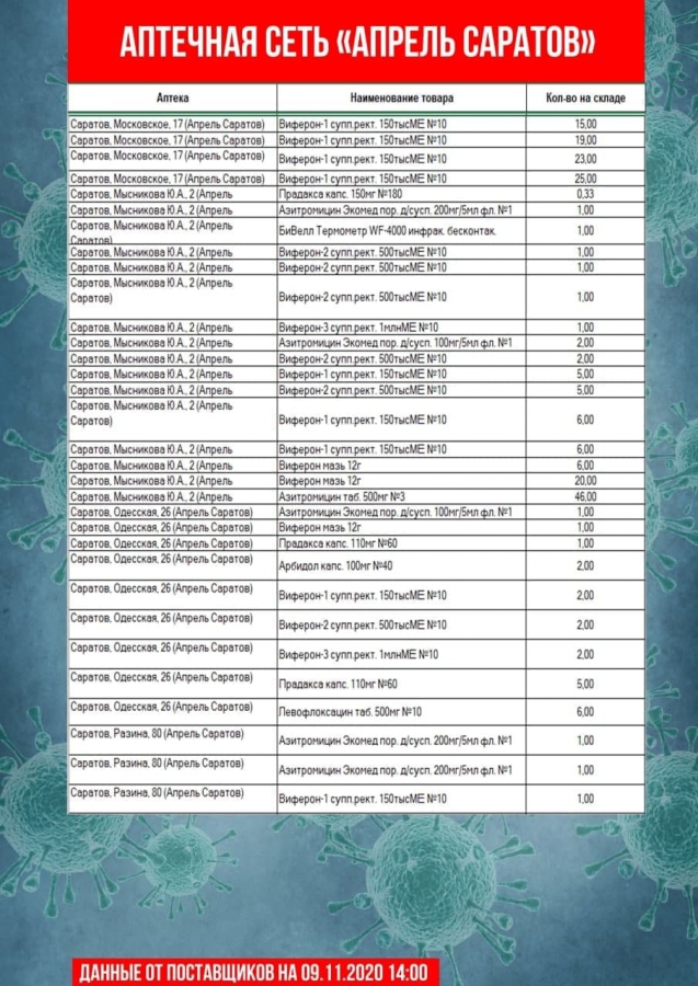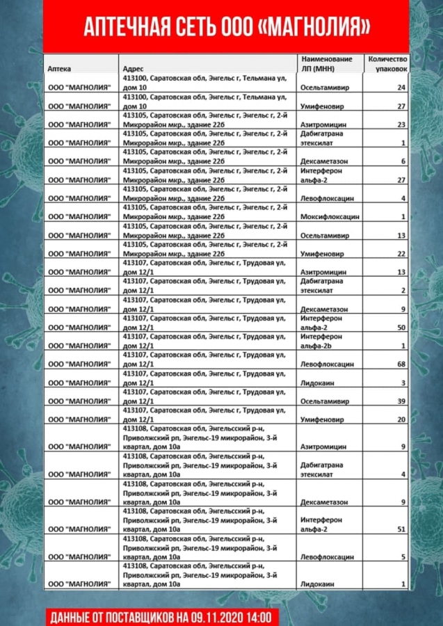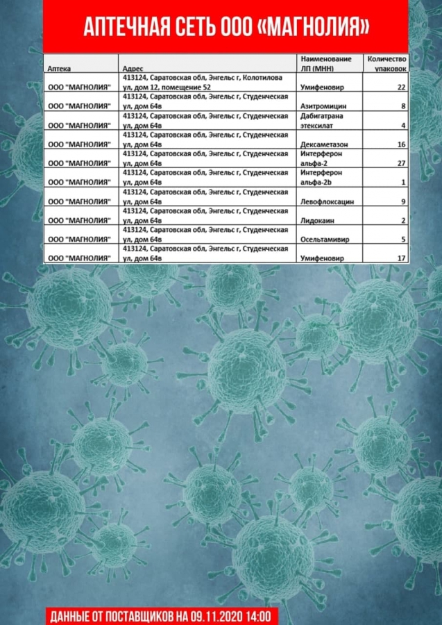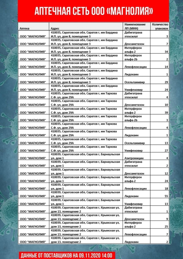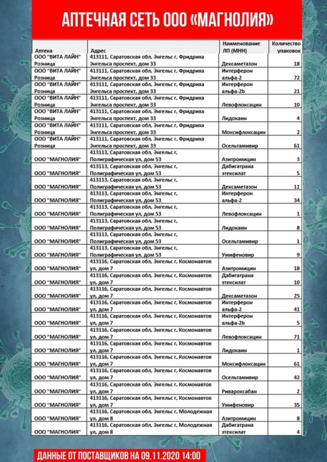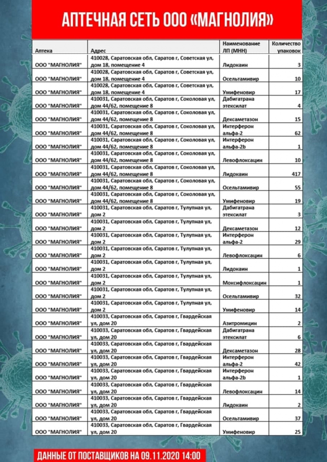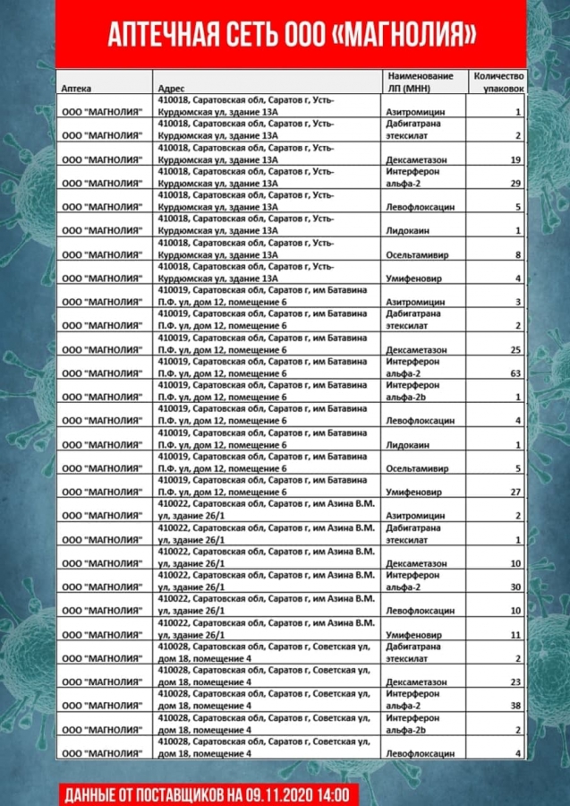 В списке отражены данные по 6 сетям аптек в Саратове и Энгельсе: «Магнолия», «Апрель Саратов», «Мир лекарств» «Ригла», «Аптека Северная» и «Сириус-Саратов». Приводятся названия препаратов, которые сейчас пользуются большим спросом, особенно на фоне пандемии коронавирусной инфекции, а также их количество непосредственно в аптеке и на складах.