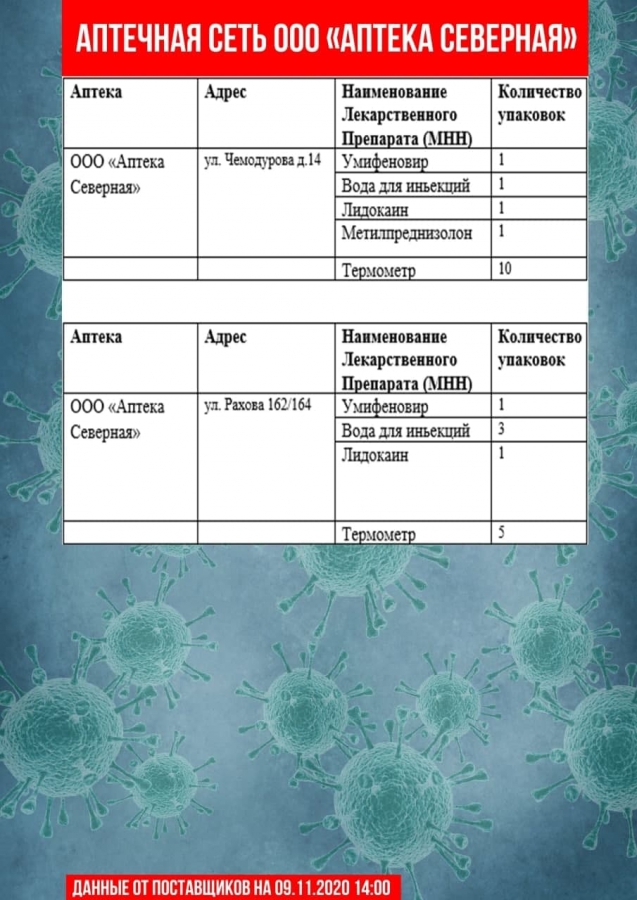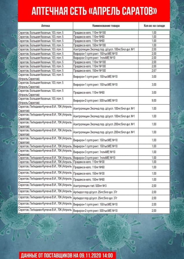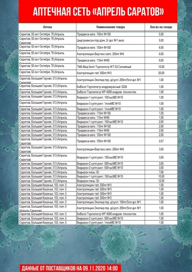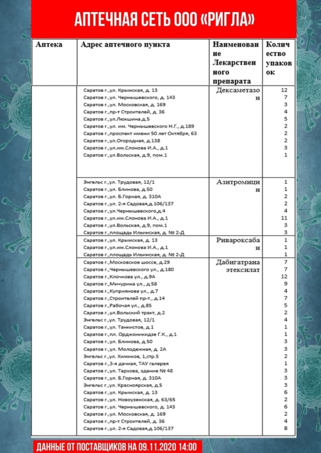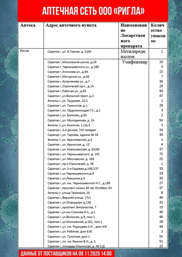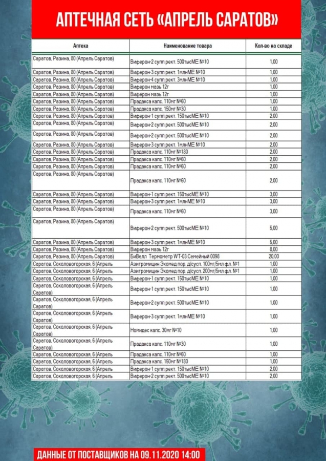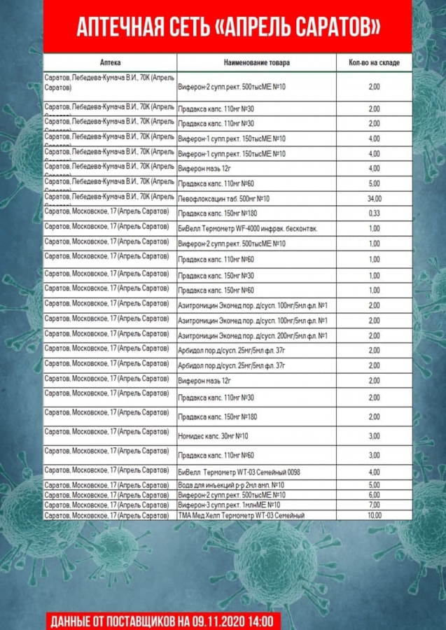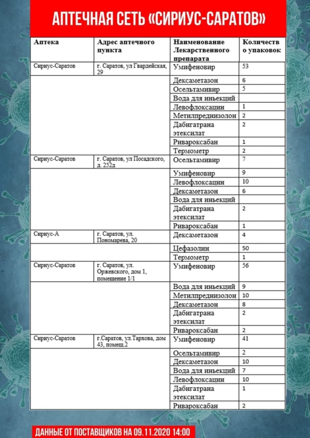 В списке отражены данные по 6 сетям аптек в Саратове и Энгельсе: «Магнолия», «Апрель Саратов», «Мир лекарств» «Ригла», «Аптека Северная» и «Сириус-Саратов». Приводятся названия препаратов, которые сейчас пользуются большим спросом, особенно на фоне пандемии коронавирусной инфекции, а также их количество непосредственно в аптеке и на складах.