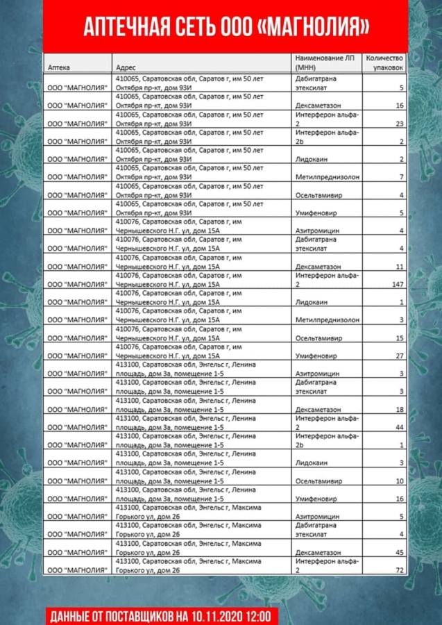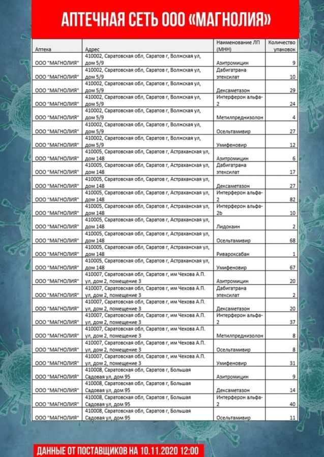 Судя по перечню, саратовцы смогут закупиться в аптеках сети «Магнолия», «Аптека северная» и «Мир лекарств». Стоит отметить, что вчера в списке было сразу 6 аптечных сетей. В нем указываются адреса аптек (все они находятся в Саратове и Энгельсе), наименование препаратов и их количество.