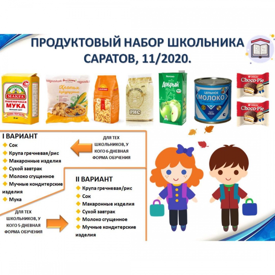 В состав наборов для тех, кто обучаются 5 дней в неделю, вошли: крупа гречневая или рис, сок, макаронные изделия, сгущенное молоко, мучные кондитерские изделия, сухой завтрак. Те, кто учится 6 дней, помимо вышеперечисленного, получат муку. На продукты, входящие в наборы, имеются соответствующие сертификаты качества.