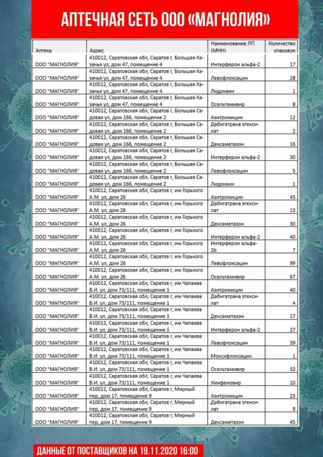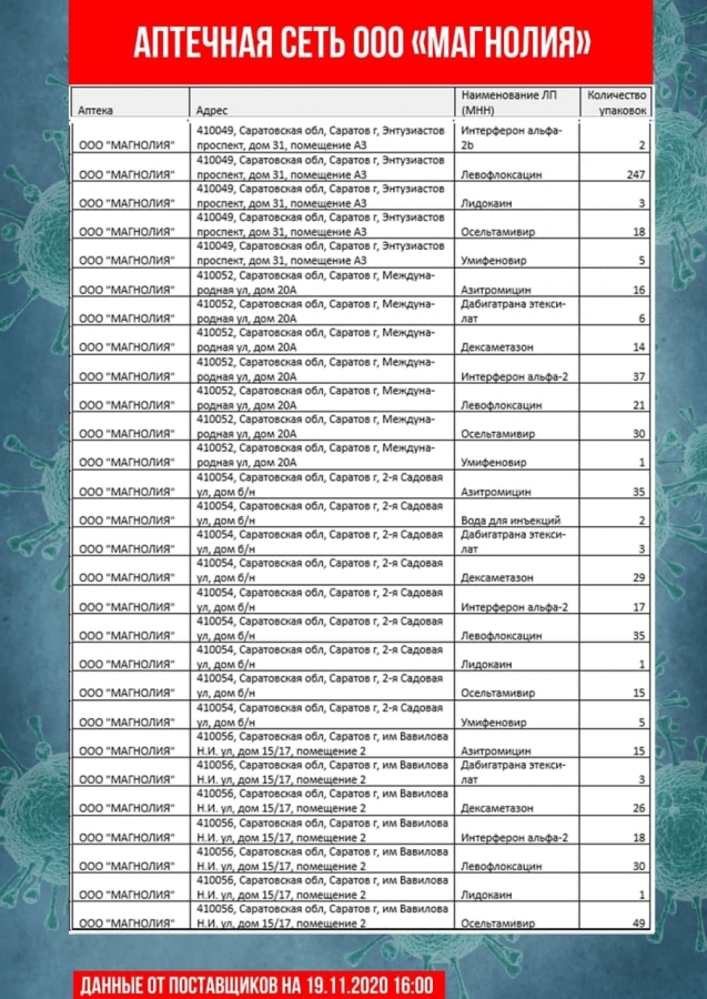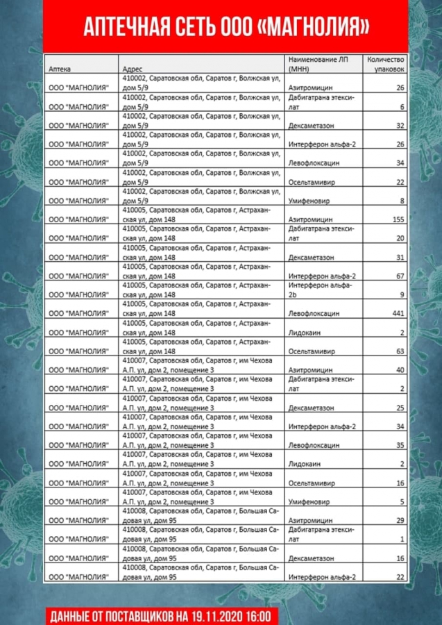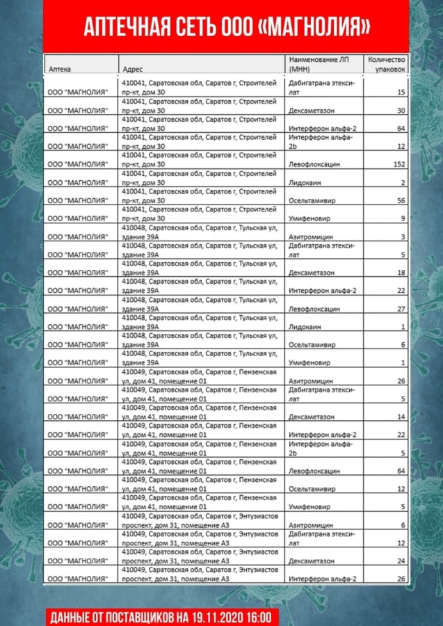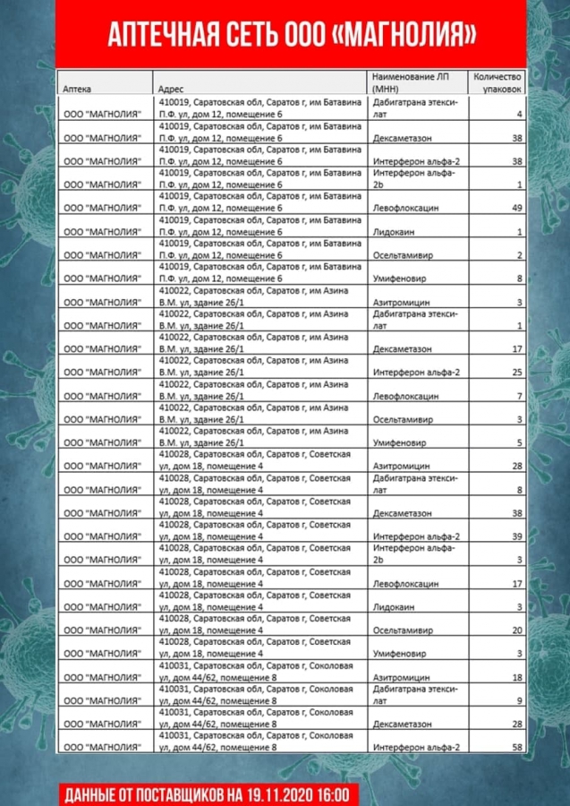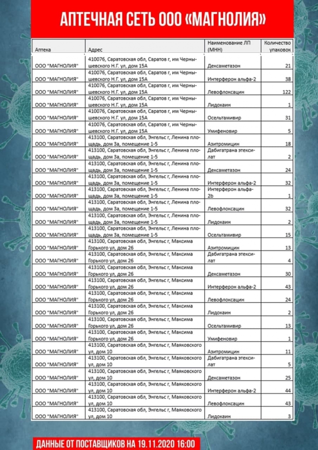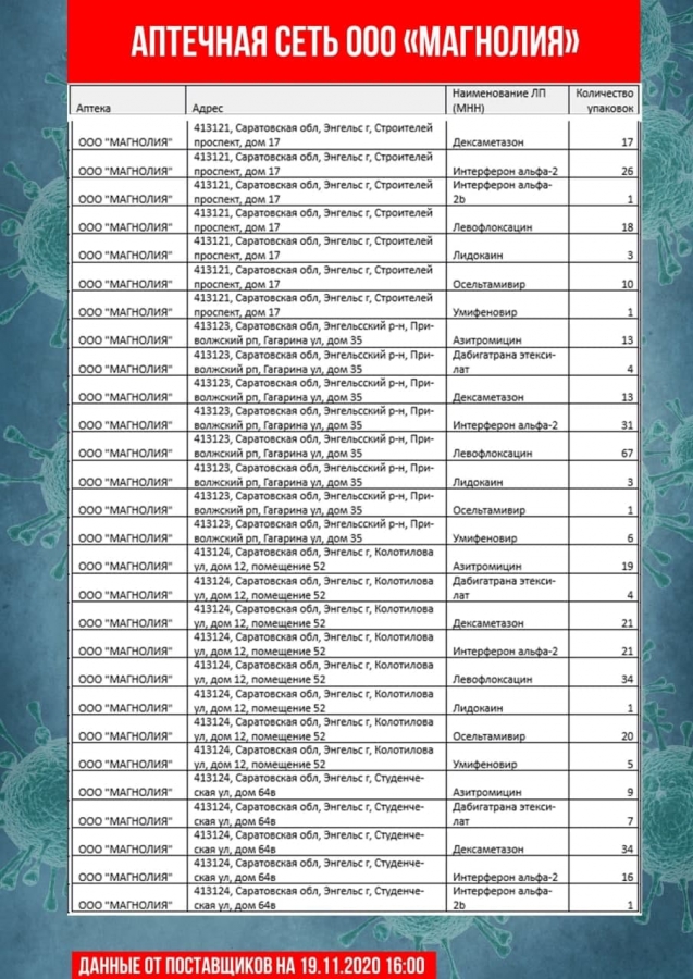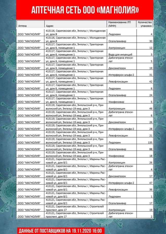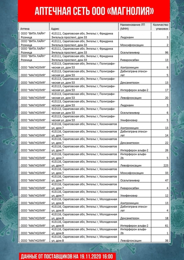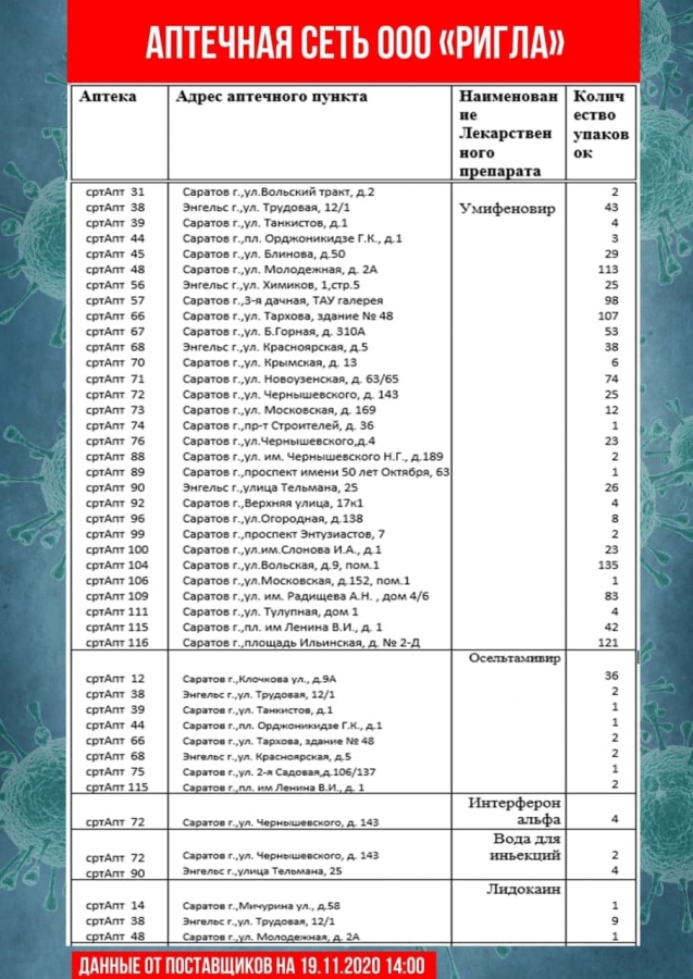 Список актуален с 14.00 до 16.00. Исходя из него, приобрести востребованные лекарств возможно в Саратове, Энгельсе, Вольске и поселке Приволжский.