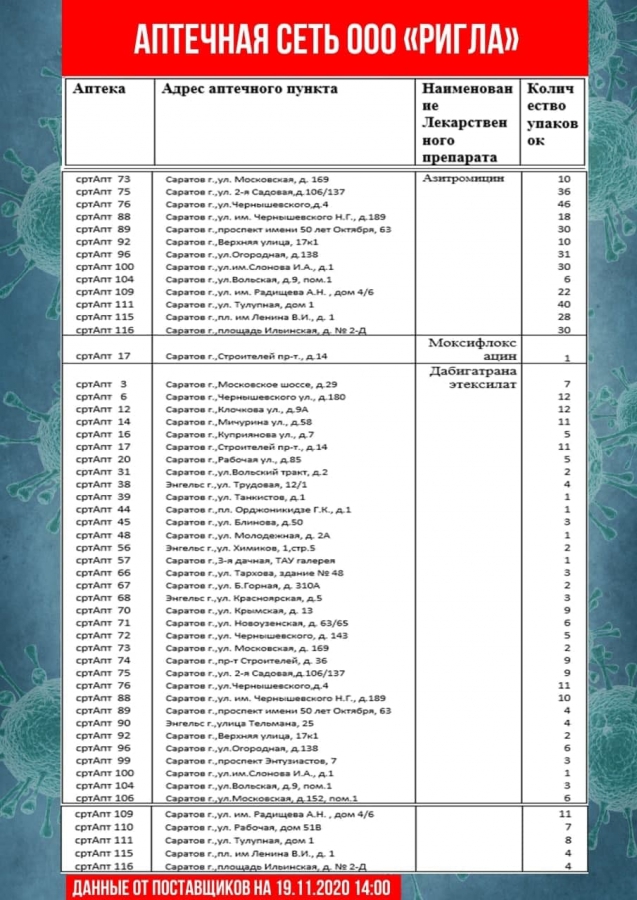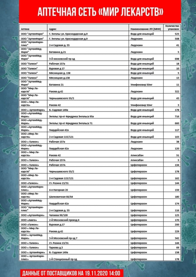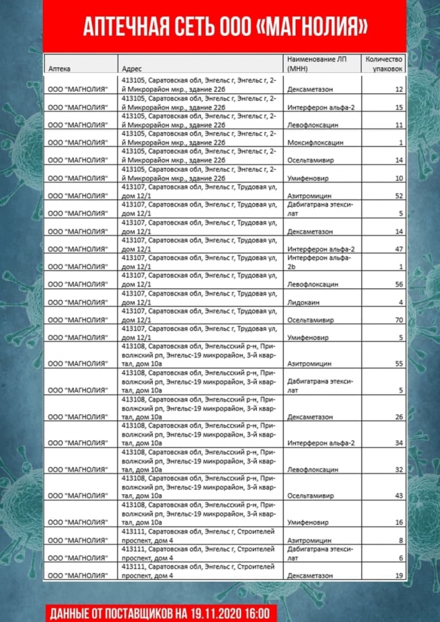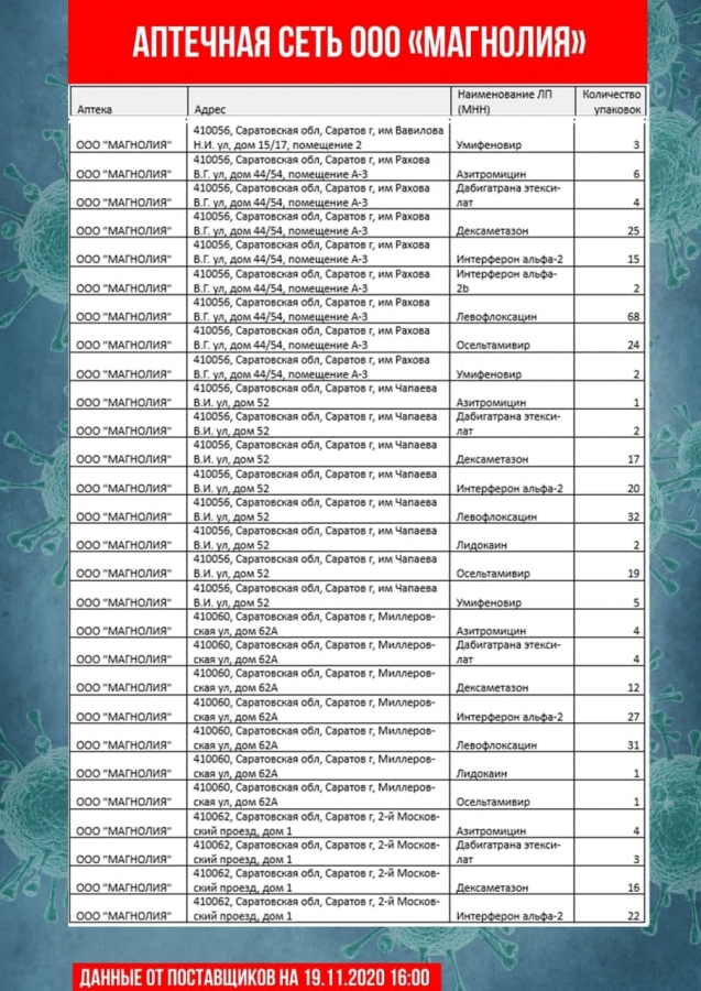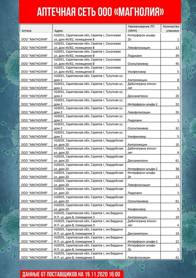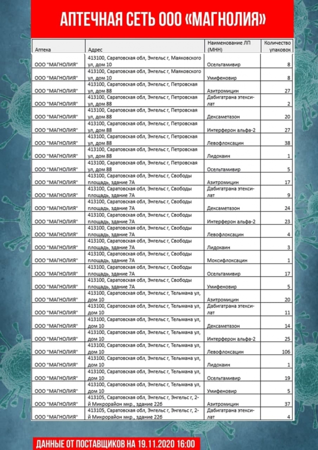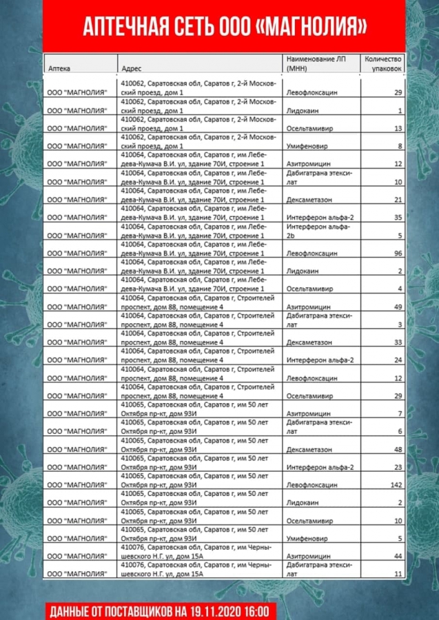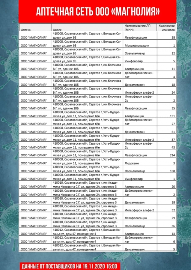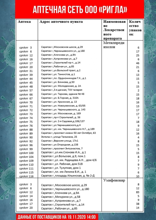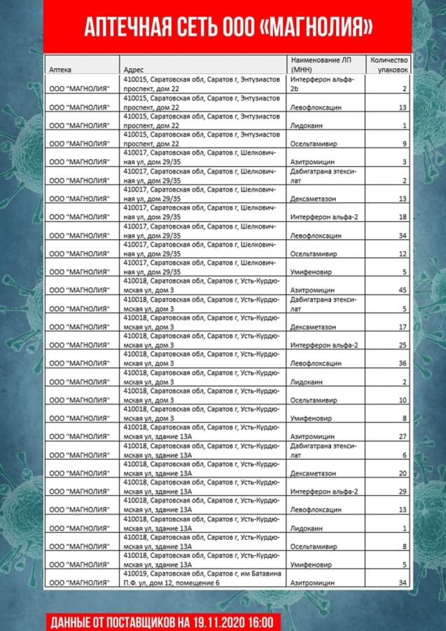 Список актуален с 14.00 до 16.00. Исходя из него, приобрести востребованные лекарств возможно в Саратове, Энгельсе, Вольске и поселке Приволжский.