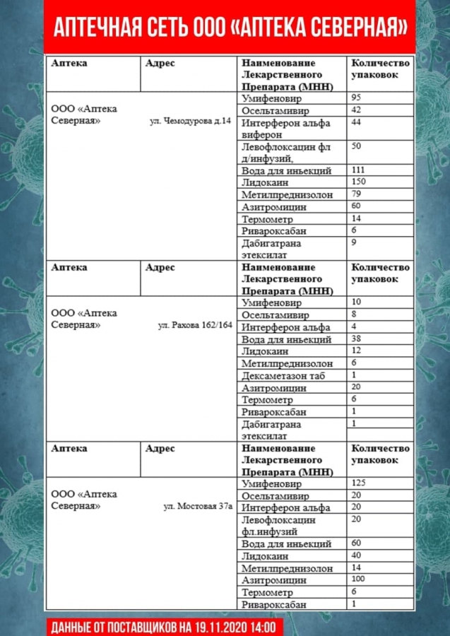 В перечне указано, что в продаже есть «Азитромицин», «Умифеновир», «Левофлоксацин», «Ривароксабан», «Прадакс», «Ингавирин» и другие препараты.