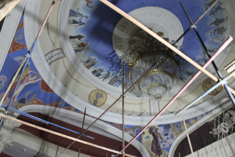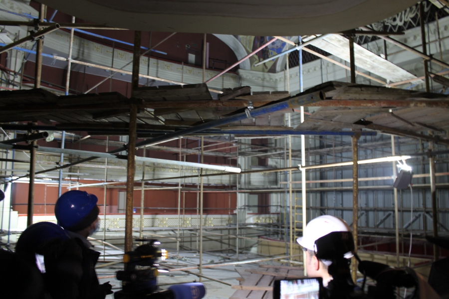 Кроме того, журналистам показали ход работ в отдельных помещениях театра. Например, в зрительном зале сейчас происходит восстановление лепного декора. Живопись на его потолке воссоздадут по ранним историческим эскизам. Те художественные образцы, которые находятся на потолке сейчас, будут калькировать, чтобы сохранить их для истории. В зале также оставят на своих местах позолоченные элементы.