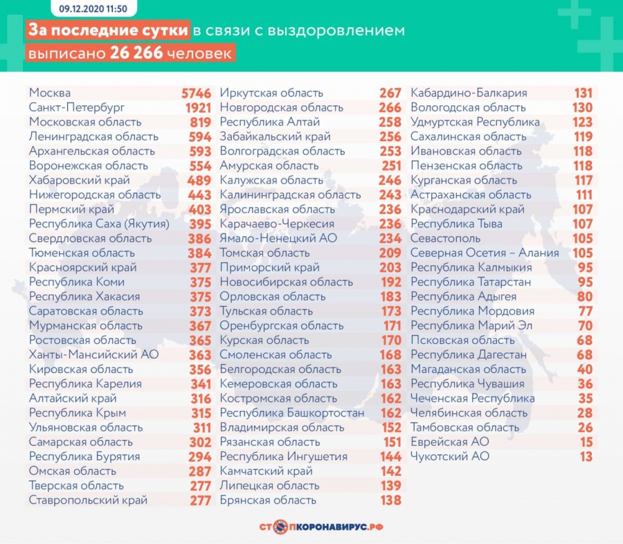 В России суточный прирост становится чуть меньше – 26 190, общее количество – 2 541 199. Скончались от коронавируса еще 559 человек, в общей сложности – 44 718. Выписаны в связи с выздоровлением еще 26 266 пациента, всего – 2 007 792.