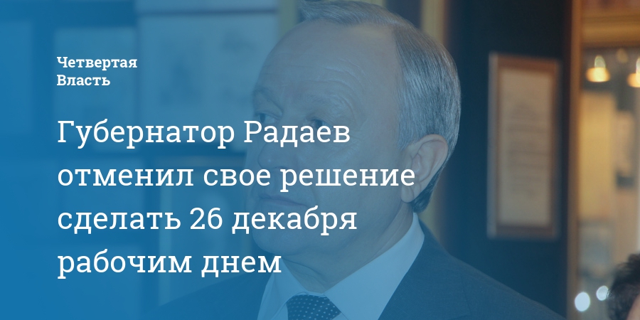 Губернатор Саратовской области Валерий Радаев отменил свое решение сделать субботу 26 декабря рабочим днем вместо 31 декабря, который объявлен выходным. Такое постановление опубликовал телеграм-канал «Пул№64».
