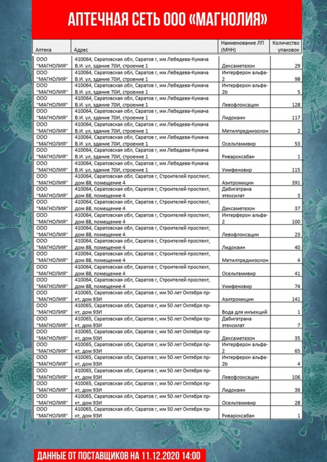 В телеграм-канале «СтопКоронавирус_Саратовская область» выложили новый перечень аптек, где можно приобрести самые востребованные препараты.
