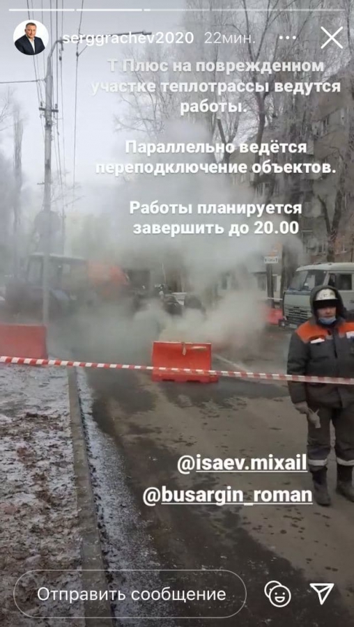 Аварию на сетях ПАО «Т Плюс» в Ленинском районе Саратова, из-за которой без тепла осталось 15 тысяч человек, пообещали устранить не позднее 20.00. Об этом с места событий сообщает первый заместитель главы города Сергей Грачев в своем Инстаграм*.