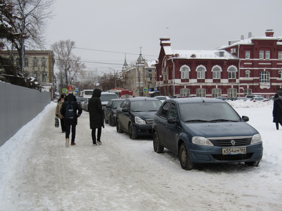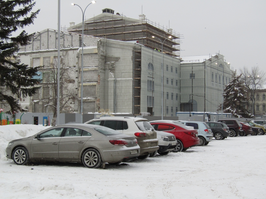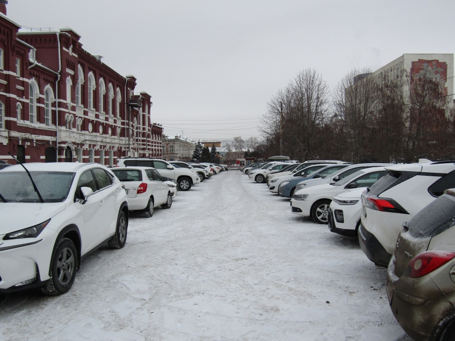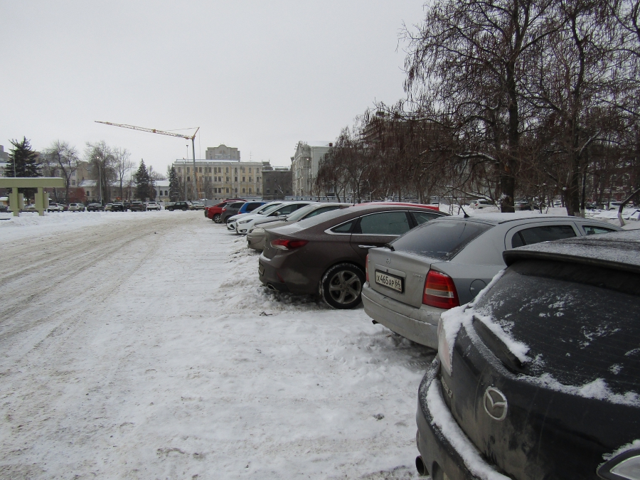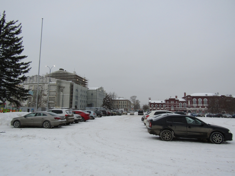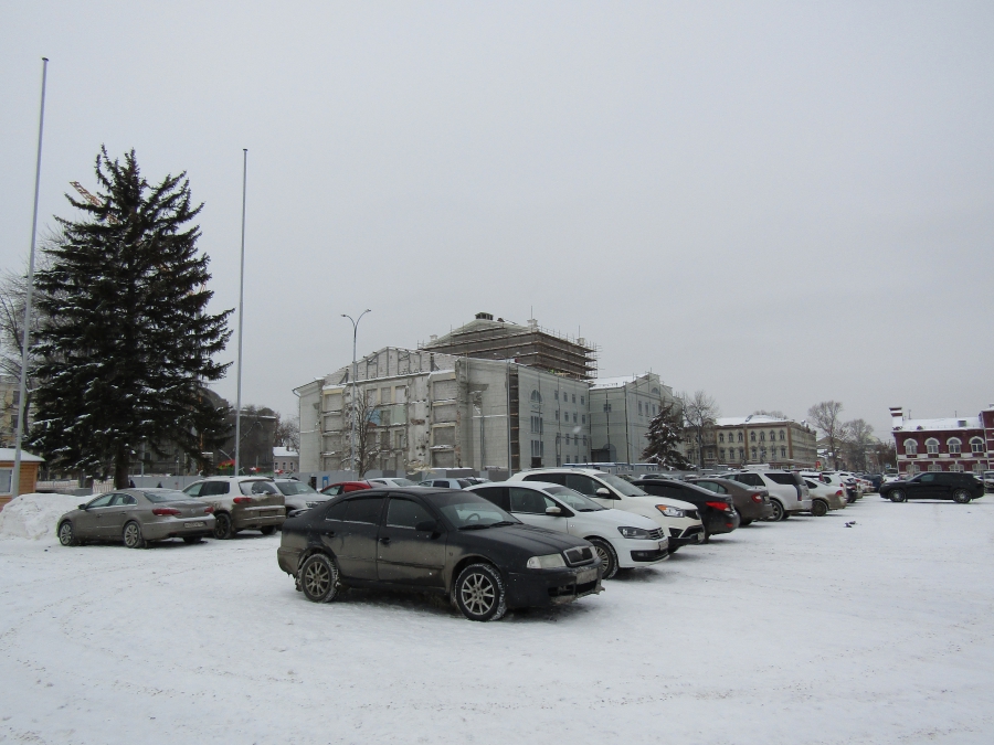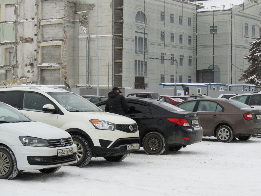 Значительная часть автомобилистов разместили свои машины также рядом с забором стройки ближе к областной универсальной научной библиотеке. При этом традиционная парковка напротив правительства региона полностью занята. Вокруг нее (преимущественно также на Театральной площади) поставили свои автомобили те, кому, видимо, не хватило на ней мест.